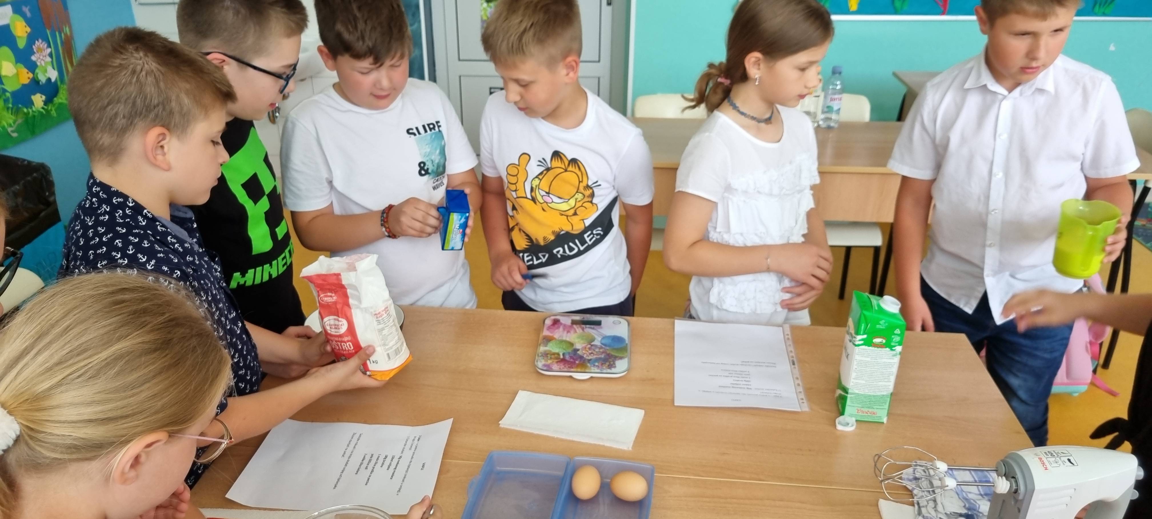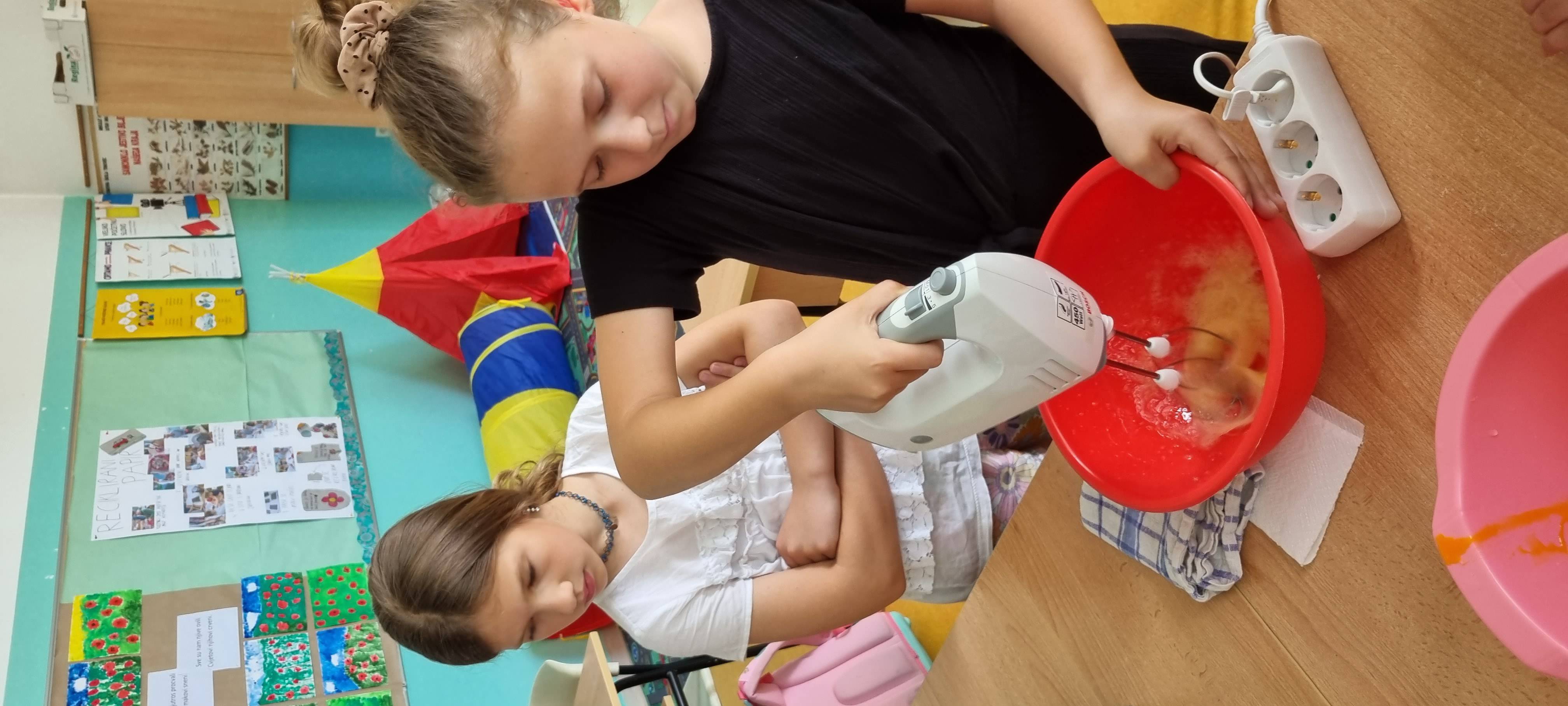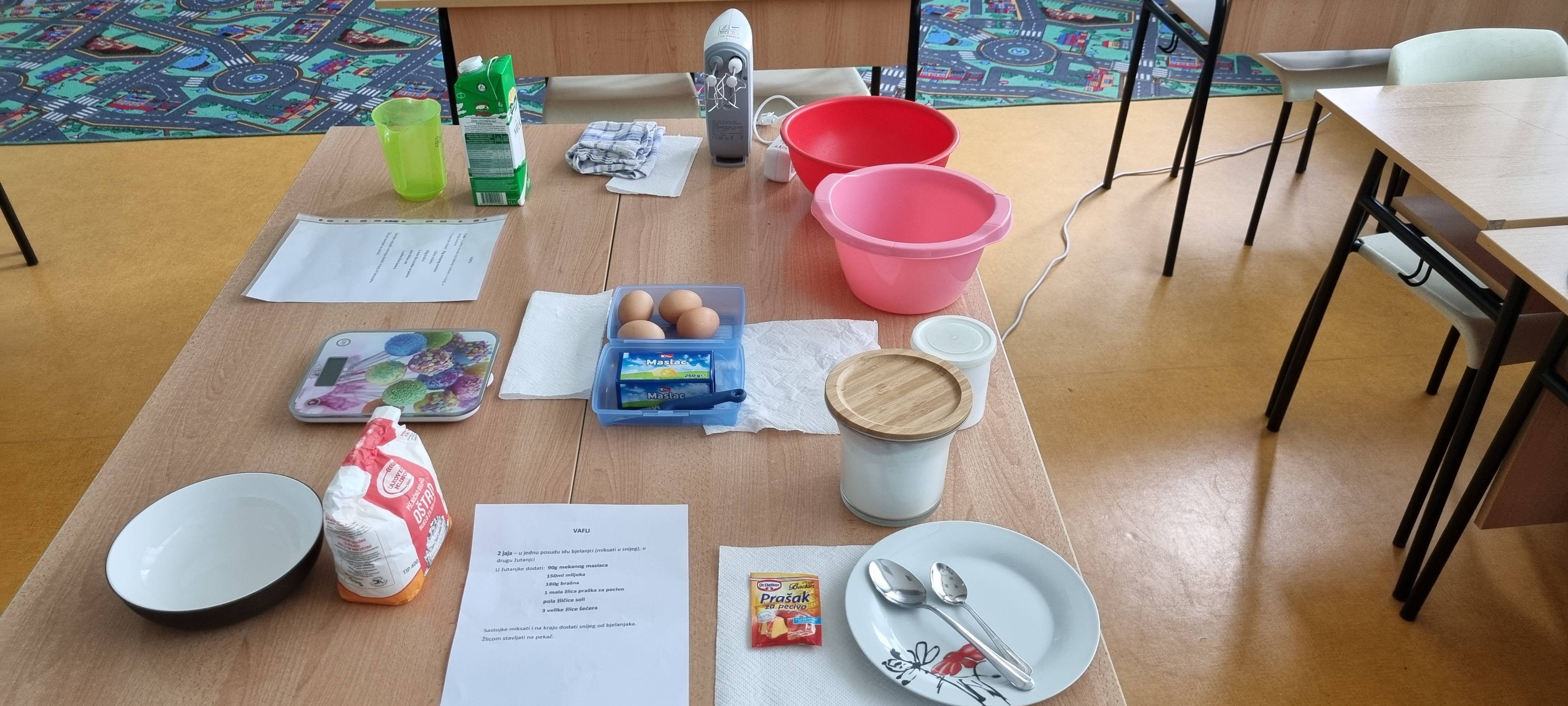 Vježbali smo mjerenje mase i određivanje volumena uz pomoć recepta za vafle. Nije bilo nimalo lako točno izvagati brašno i maslac, odvojiti bjelanjak od žutanjka ili odrediti točnu količinu mlijeka, ali uz međusobnu pomoć i suradnju sve smo uspjeli.
