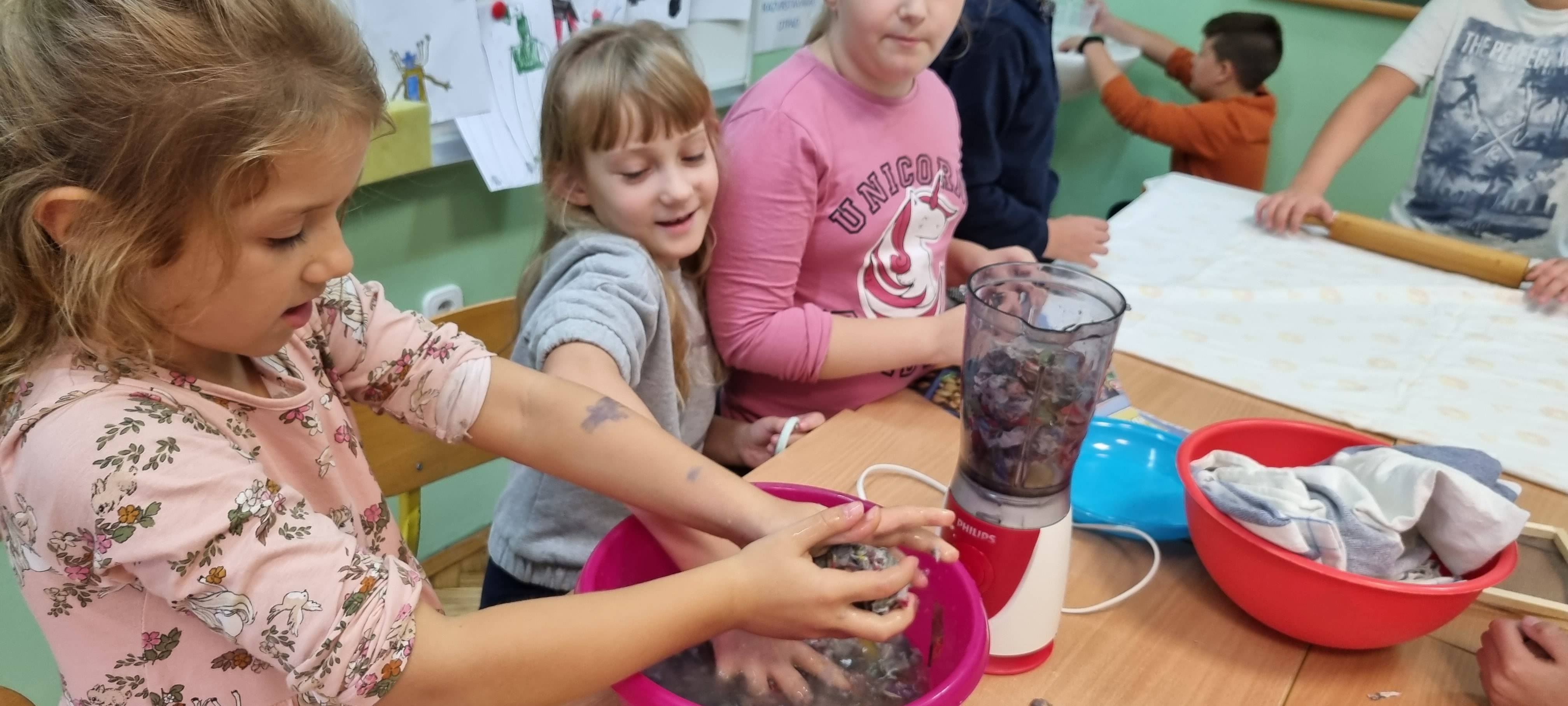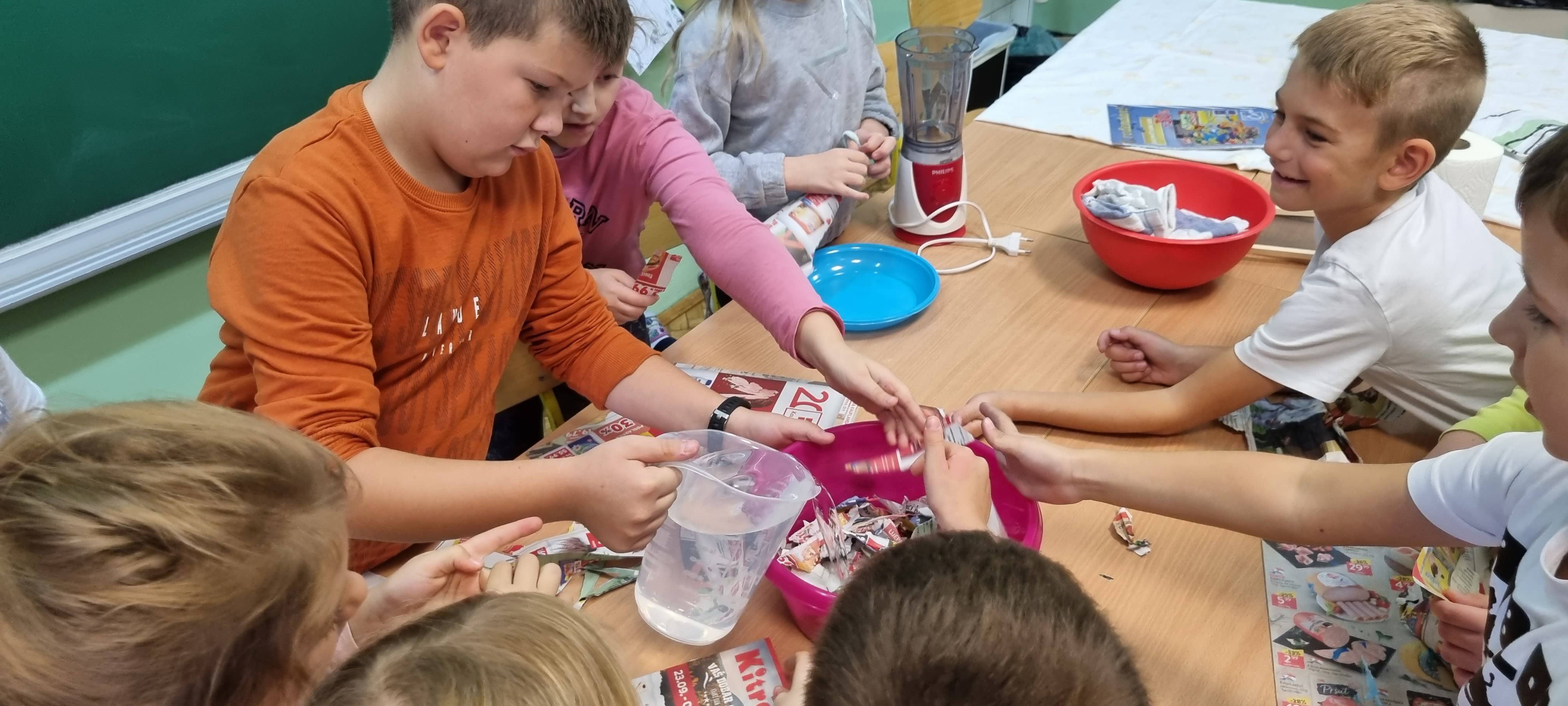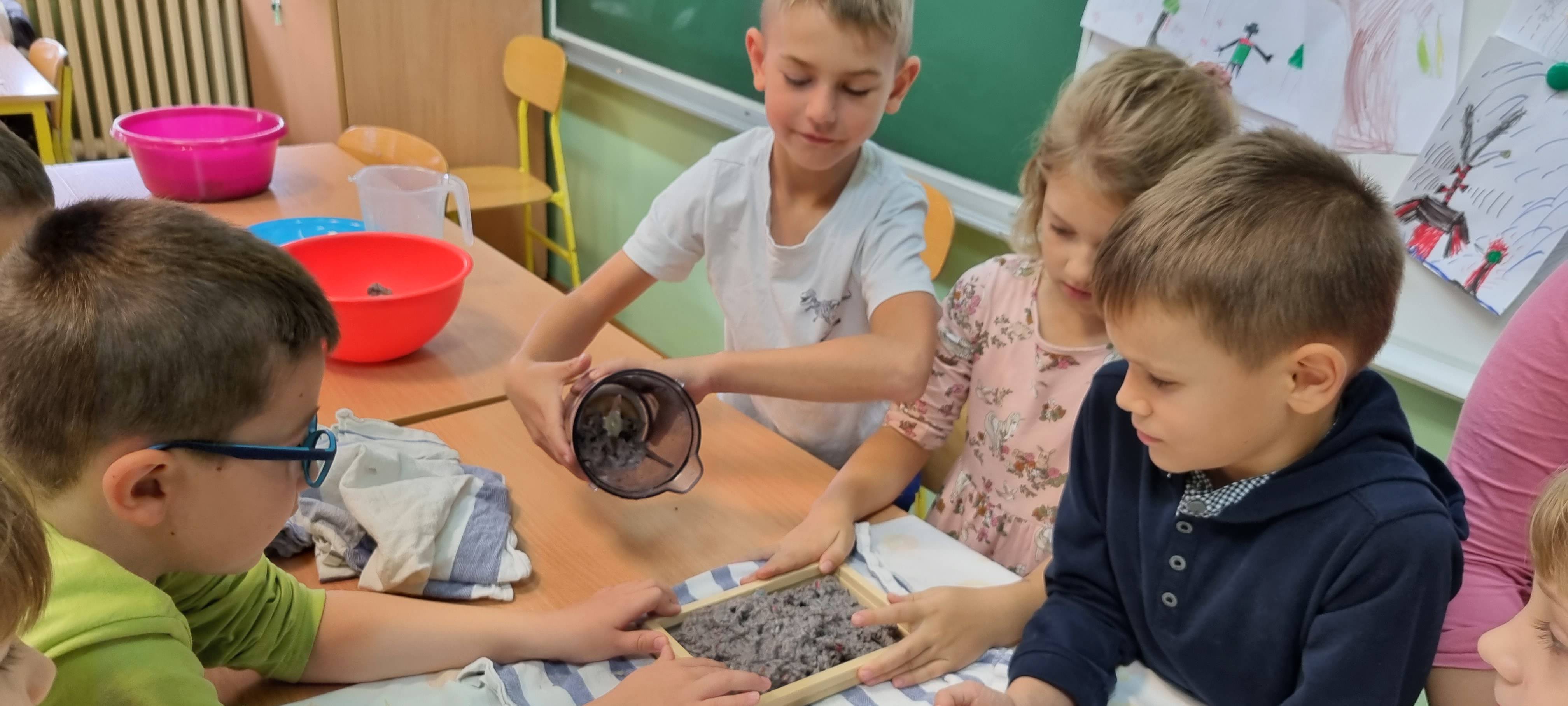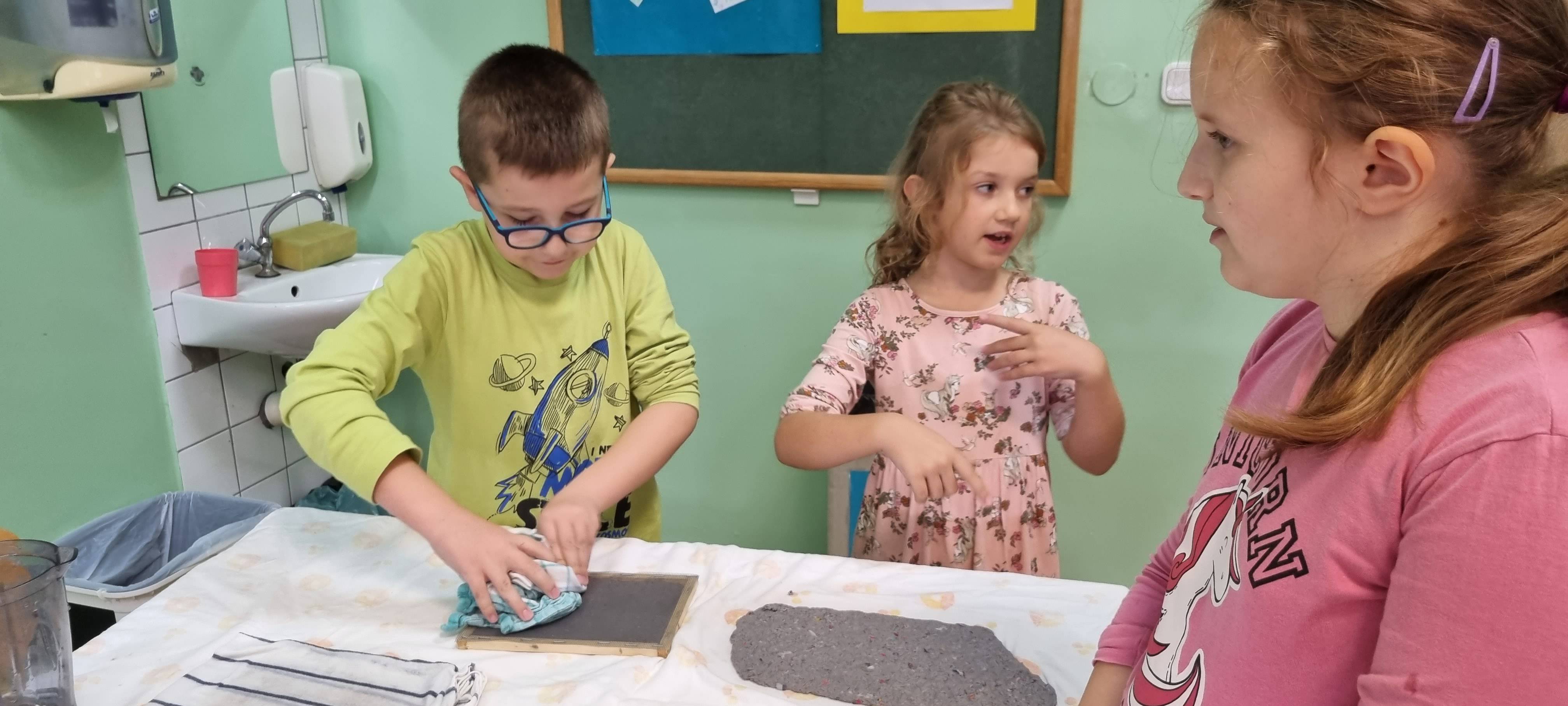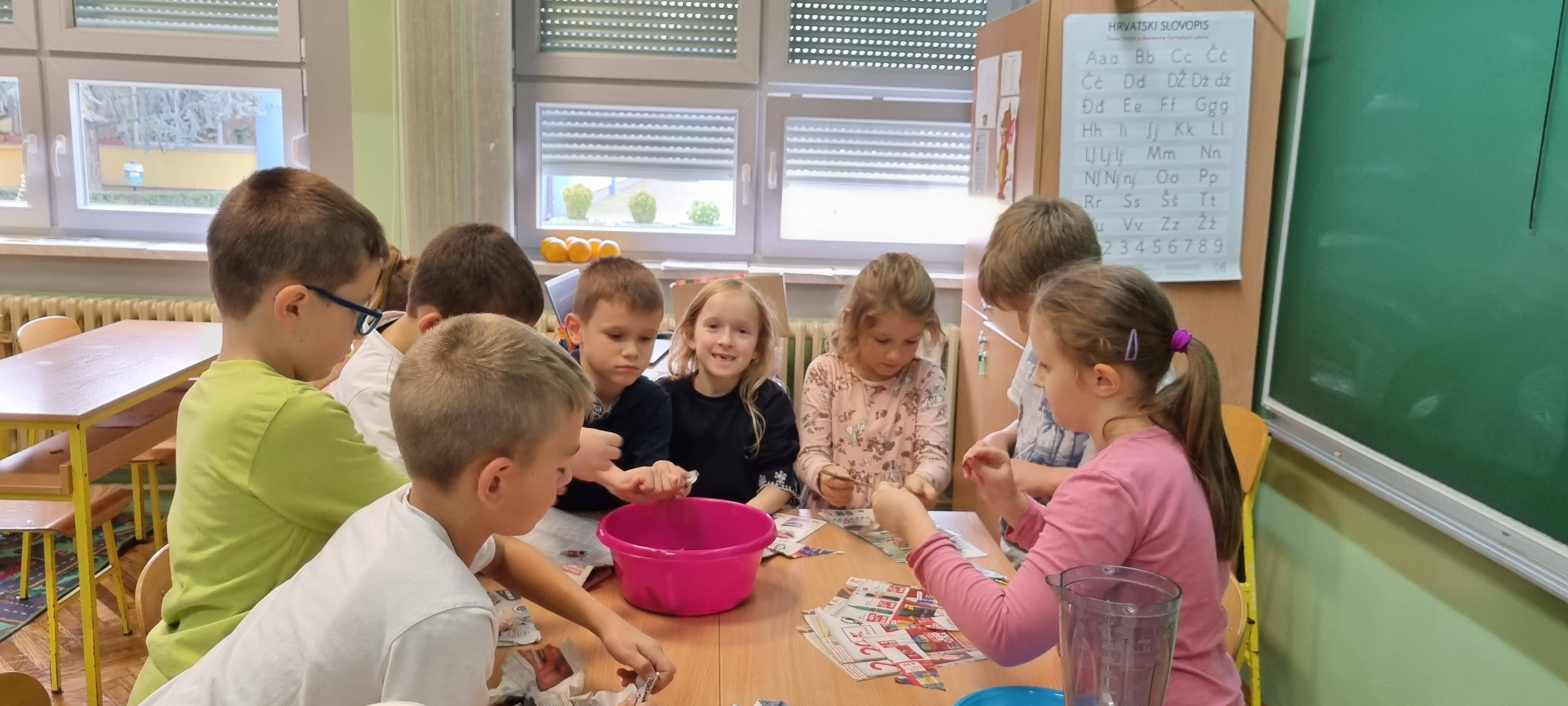 Sortirajući prikupljeni stari papir naši prvašići su tako učili što sve stavljamo u spremnik za odlaganje papira. Istražili smo i što se ne smije stavljati. Naučili smo da se papir pravi od drva i da od starog papira može nastati novi te se tako može spasiti puno stabala koja nam daju kisik. Učenici 1.a razreda sudjelovali su u radionici recikliranja papira uz malu pomoć učenika 4.a razreda Marka i Benjamina Jana, a svoje znanje prenijeli su i učenicima 1.b razreda.