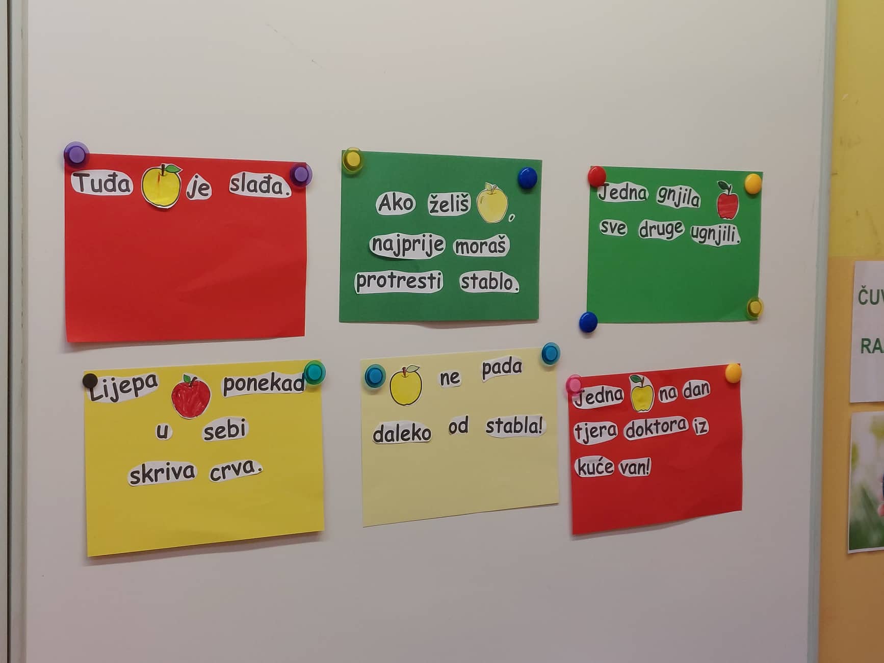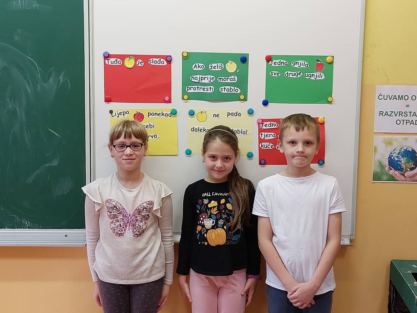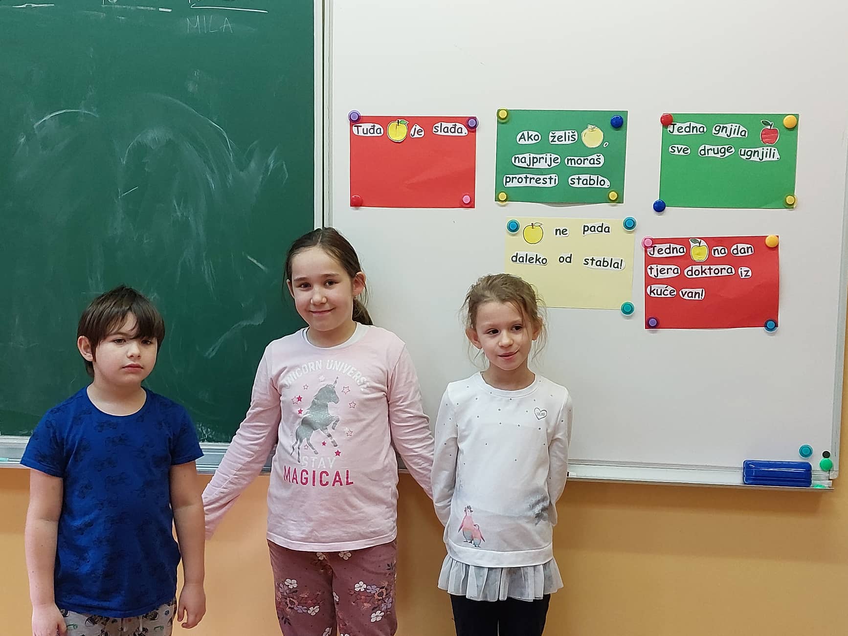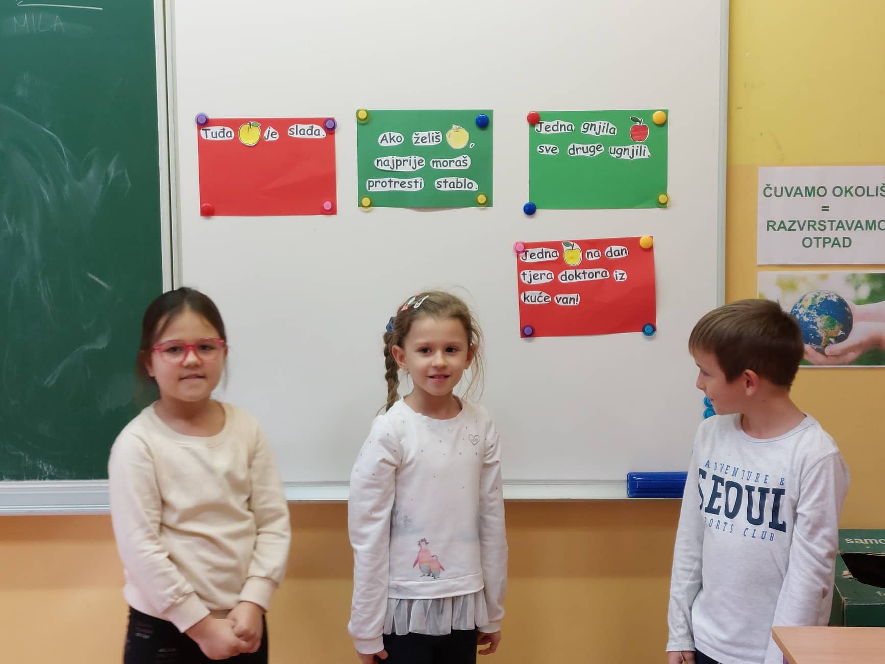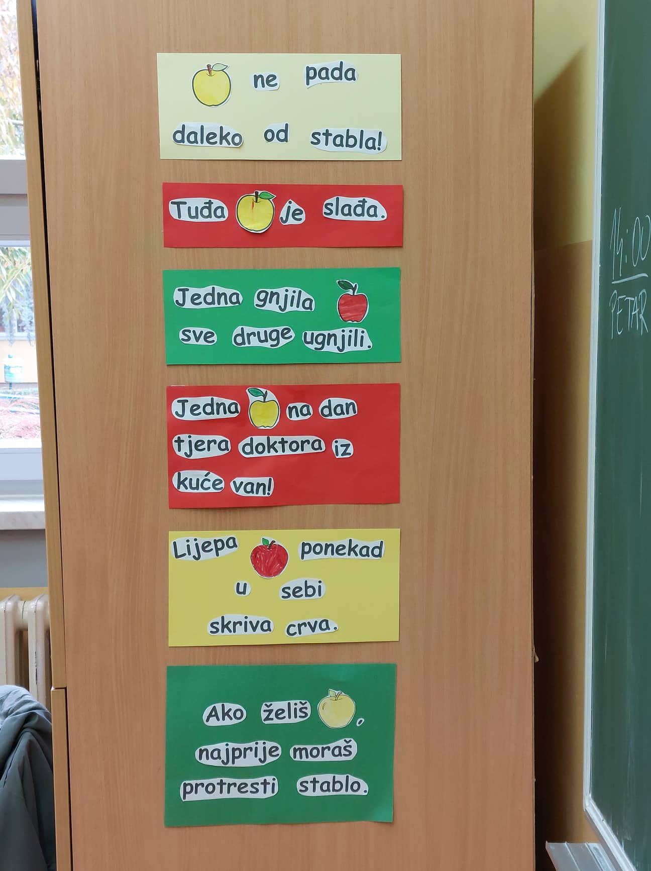 Dan jabuka obilježili smo izrekama o jabukama. Na samom početku istražili smo što su to poslovice ili izreke. Učenici su se pokušali sami sjetiti nekih izreka o jabukama. O njima smo razgovarali, tumačili i napravili plakatiće.