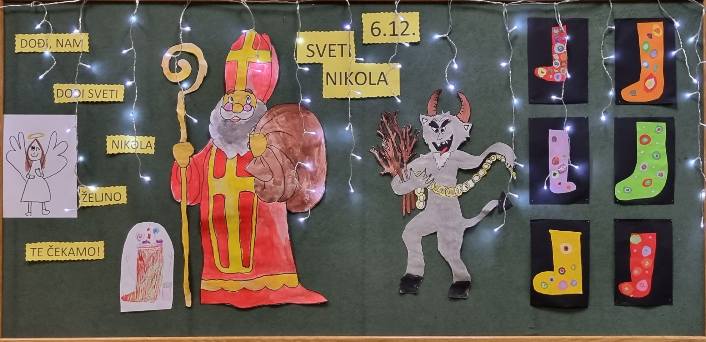 S nestrpljenjem čekamo svetog Nikolu jer naravno svi smo bili dobri ove godine i veselimo se slatkišima koje će nam donijeti. Ukrasili smo razredni pano sa čizmicama i strašnim krampusom kojeg se uopće ne bojimo.