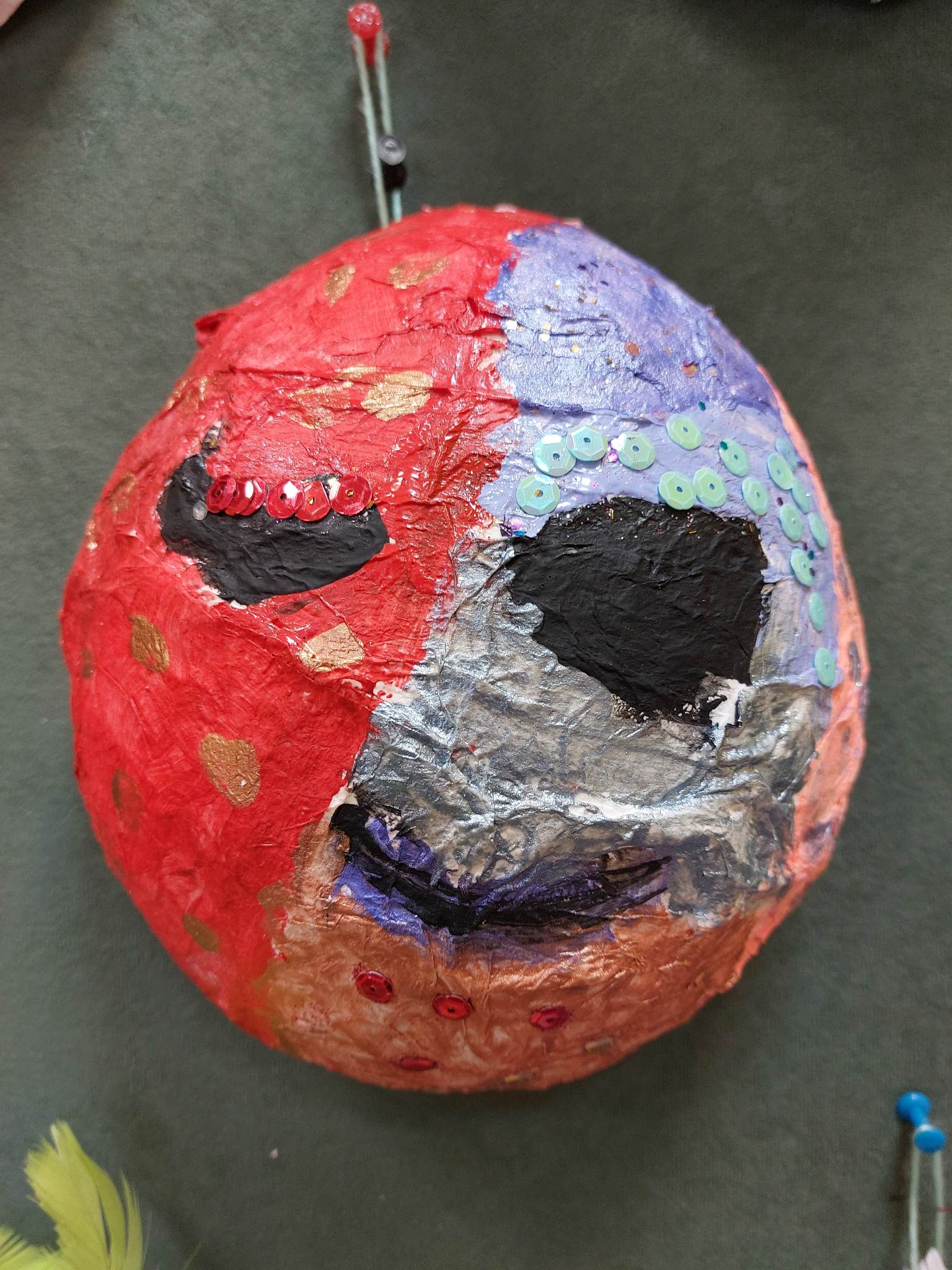 Potom smo probušili balone i izrezali oblike balona na dva dijela. Tako smo dobili masku.