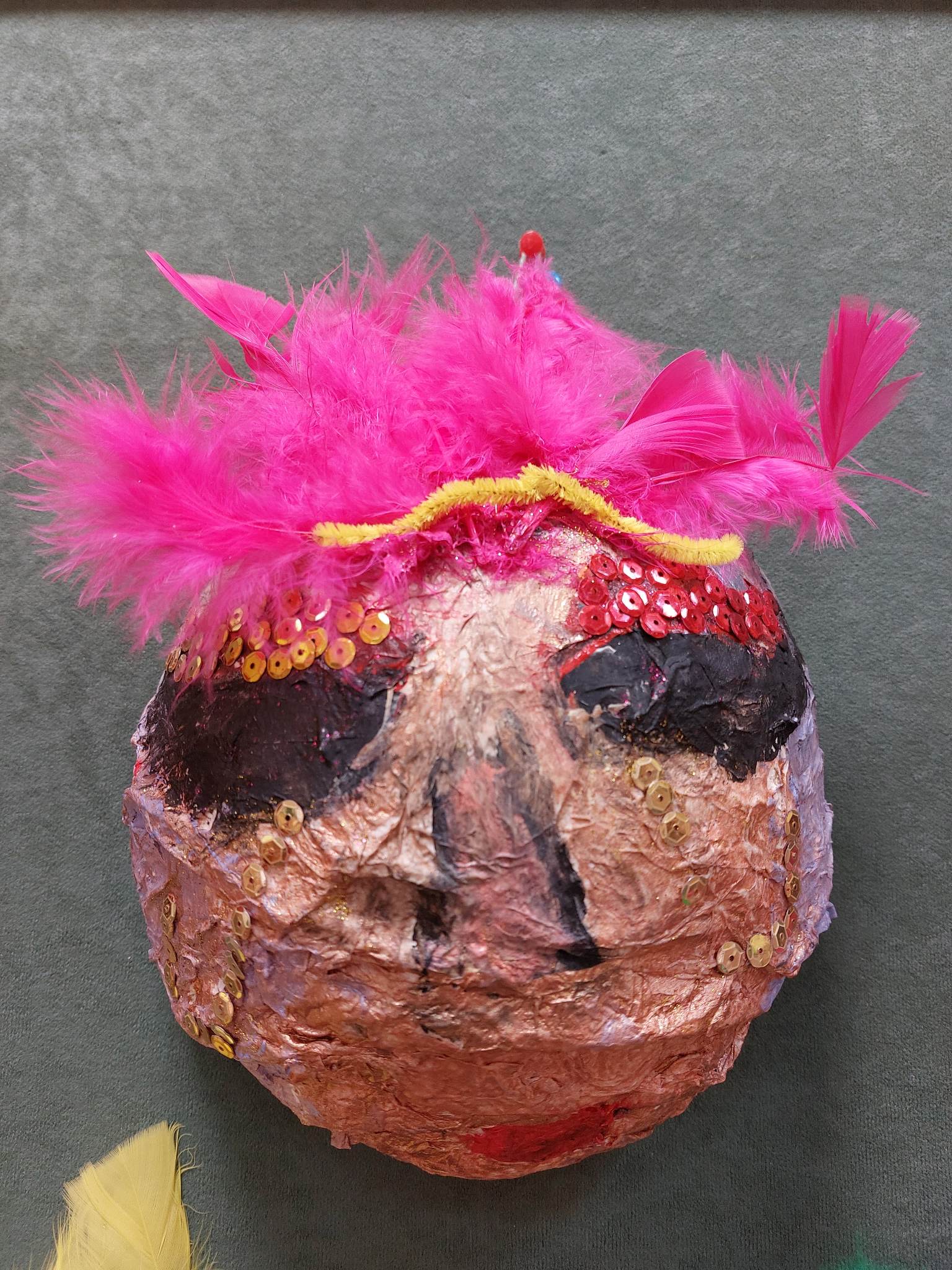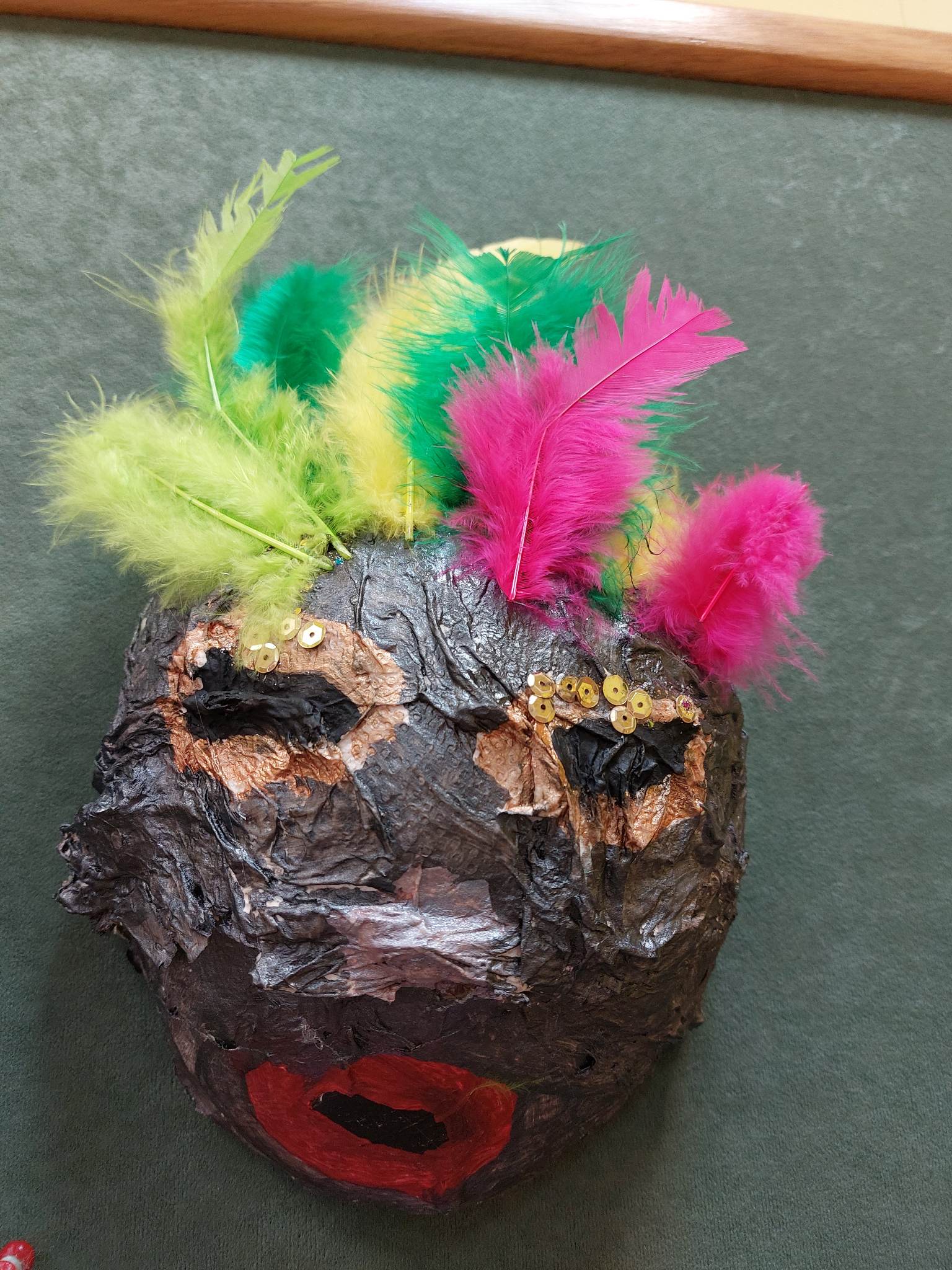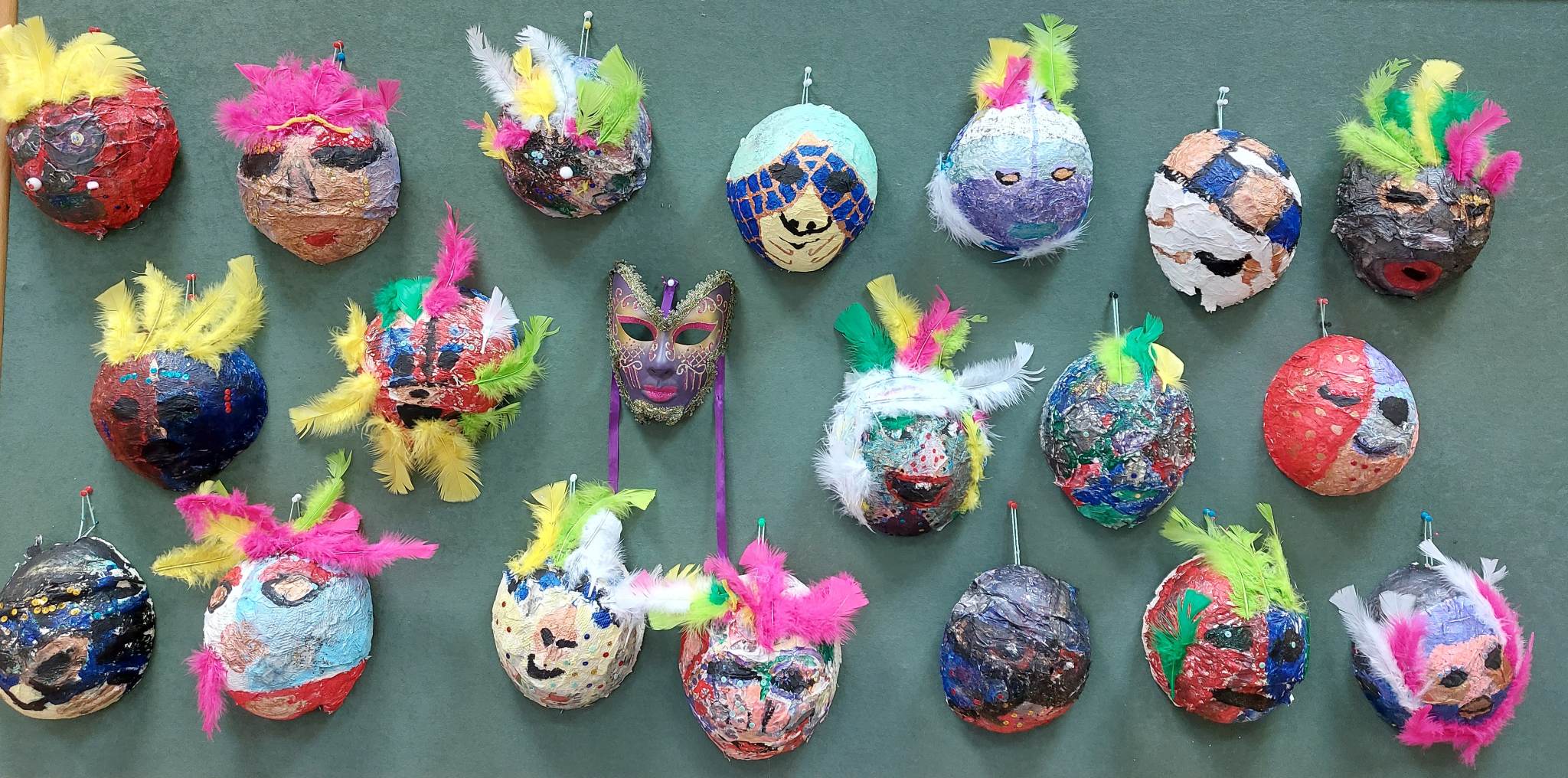 Akrilnim bojama, šljokicama, cirkonima i perjem ukrasili smo maske koje sada krase našu učionicu.
