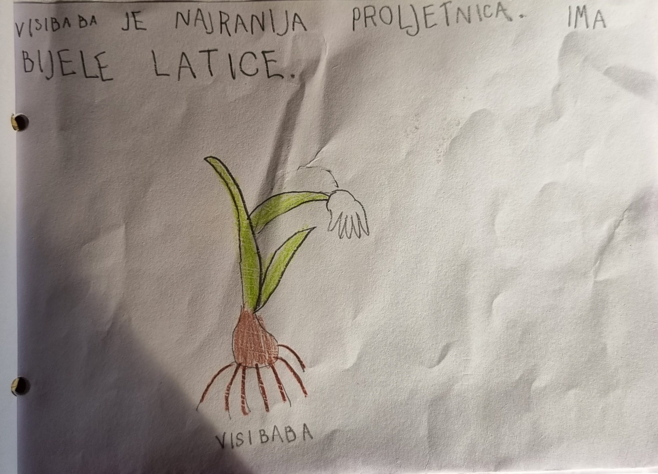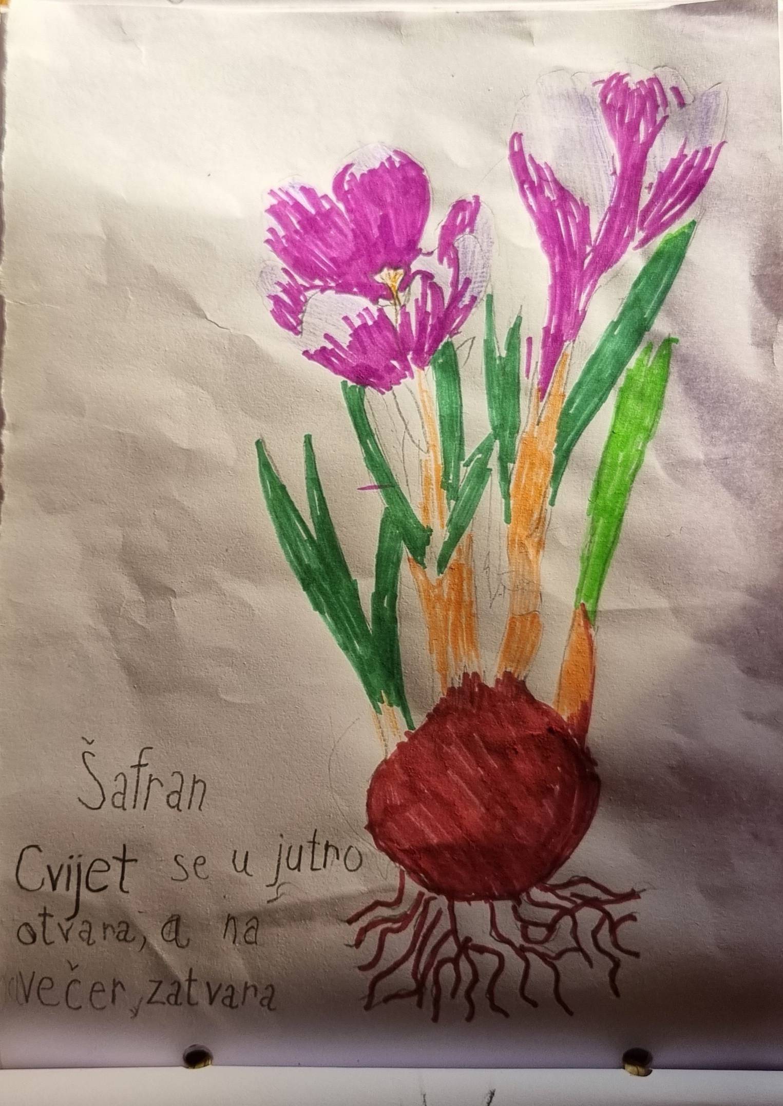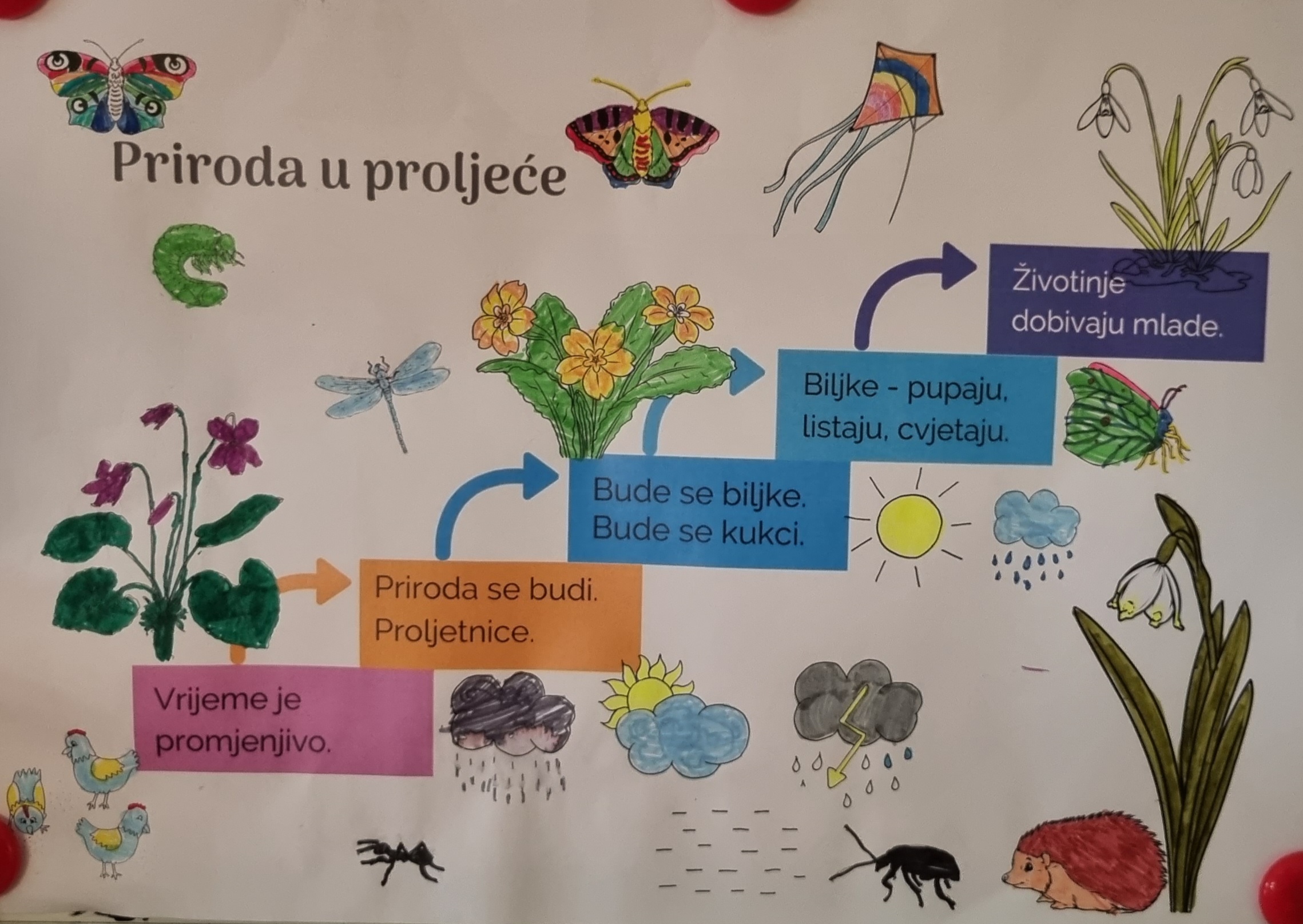 U našem školskom dvorištu rastu prekrasne proljetnice - jaglaci, zumbuli, visibabe, ljubičice, tulipani, narcise i kukurijek. Prvačići nisu mogli odoljeti njihovoj ljepoti te su ih odlučili bolje upoznati. Svaku proljetnicu smo imenovali i opisali (boja latica i oblik lista), brojali smo latice i naravno mirisali. Naučili smo da su proljetnice zaštićene i da ih ne treba ubirati. Svaki učenik je izabrao najdražu proljetnicu koju je nacrtao i napisao rečenicu ili dvije o tome što je naučio. Crteže smo objedinili u malu knjižicu koju učenici rado listaju i proučavaju.