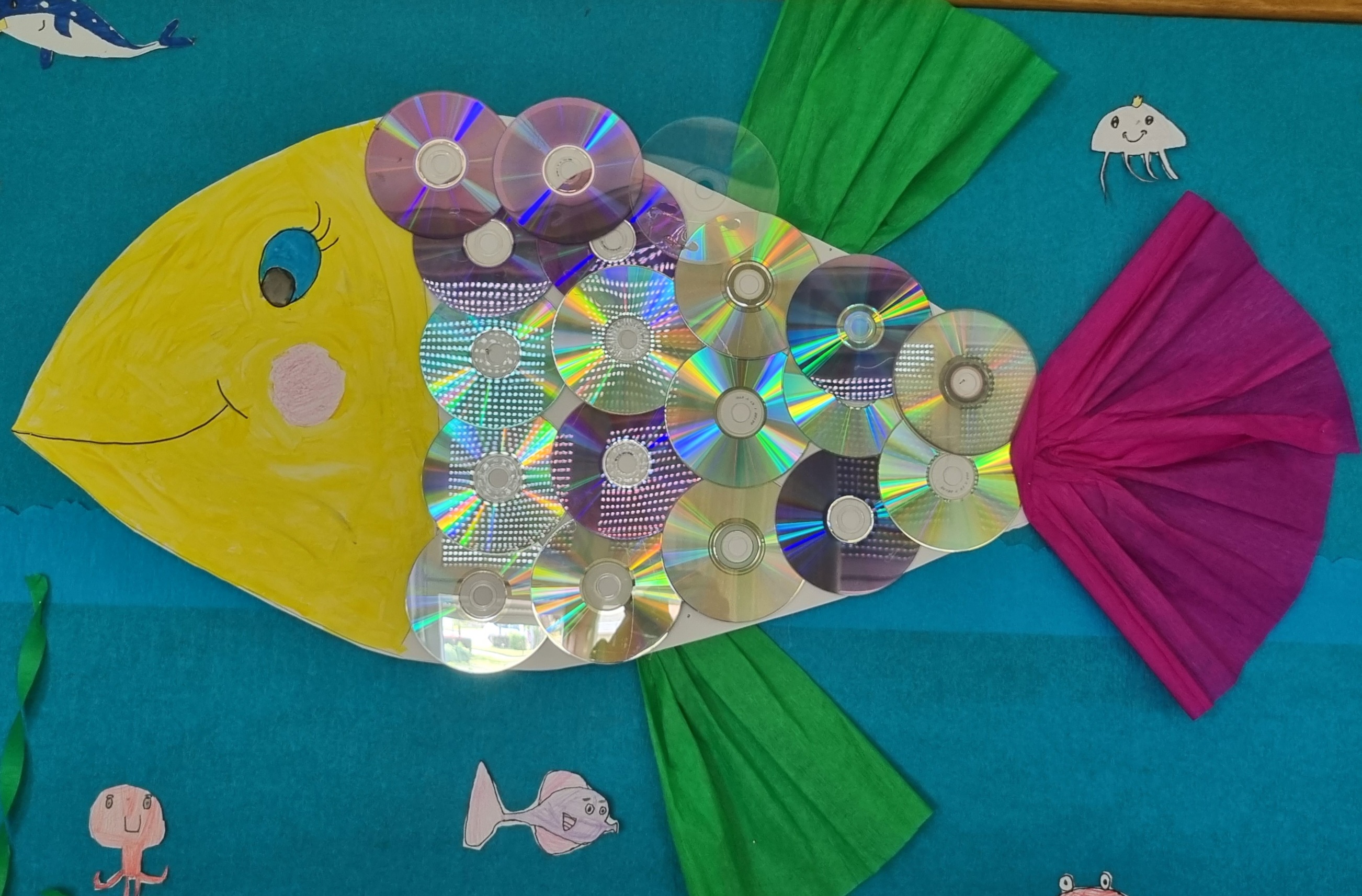 Željeli smo dašak ljeta prenijeti i u našu učionicu produženog boravka pa smo pano uredili morskim životinjama. Na crtežima su se tako našle hobotnice, zvjezdače, rakovi, kitovi, kornjače i naravno ribice.