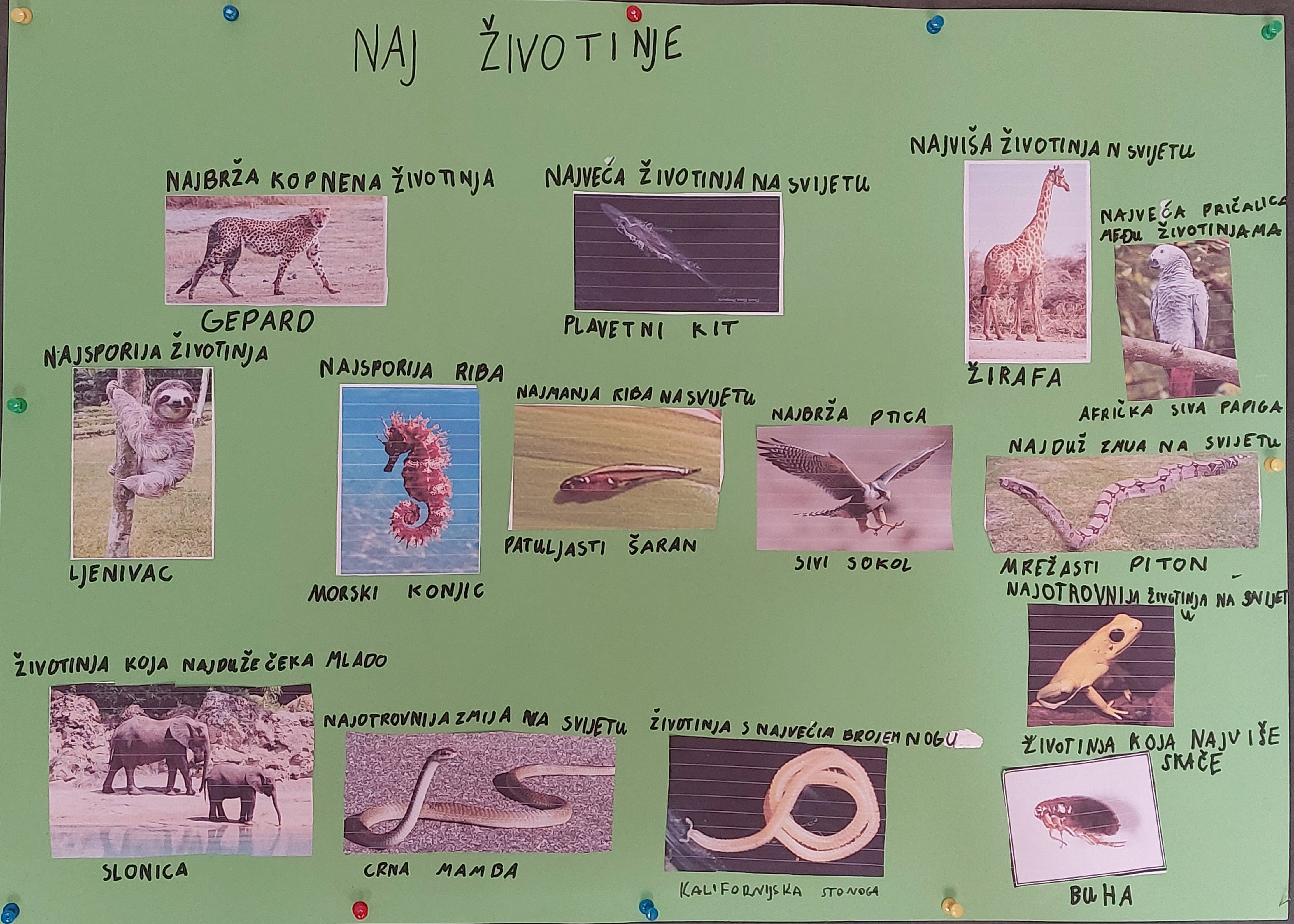 Kroz radionicu "Naj životinje" obilježili smo svjetski dan zaštite životinja. Učenici su u parovima pokušali svrstati životinje u tablicu. Neke od kategorija u tablici bile su: najbrža kopnena životinja, najbrža ptica, najotrovnija životinja, najduža zmija, najveća životinja, najveća pričalica među životinjama, životinja koja najduže nosi mlado itd. Potom smo pogledali PowerPoint prezentaciju o životinjama. Pomoću naučenih informacijama o životinjama napravili smo plakat.