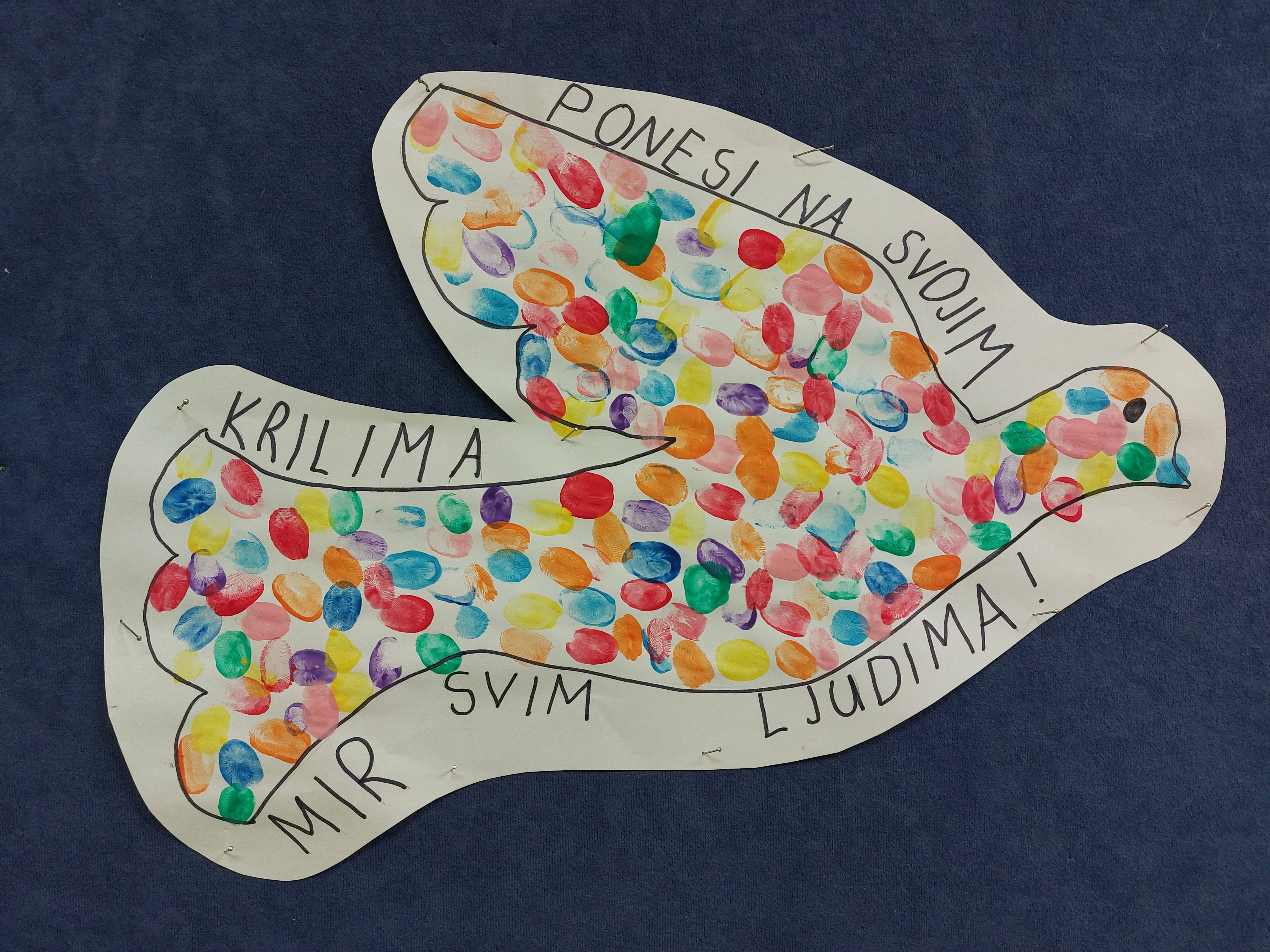 Kroz razgovor, likovnu i literarnu radionicu dotaknuli smo se Domovinskog rata i svih žrtava koje su hrvatski gradovi i građani podnijeli. Zaključili smo da je rat veliko zlo koje svim ljudima, a ponajviše djeci, uništava život. Inspirirani tim događajima, učenici su u parovima napisali nekoliko važnih poruka. Izdvojili smo neke i stavili ih na razredni pano. Središte našeg panoa krasi golubica mira u koju smo svi otisnuli nekoliko svojih otisaka prsta sa željom da poleti u sve krajeve svijeta i donese mir svim ljudima.