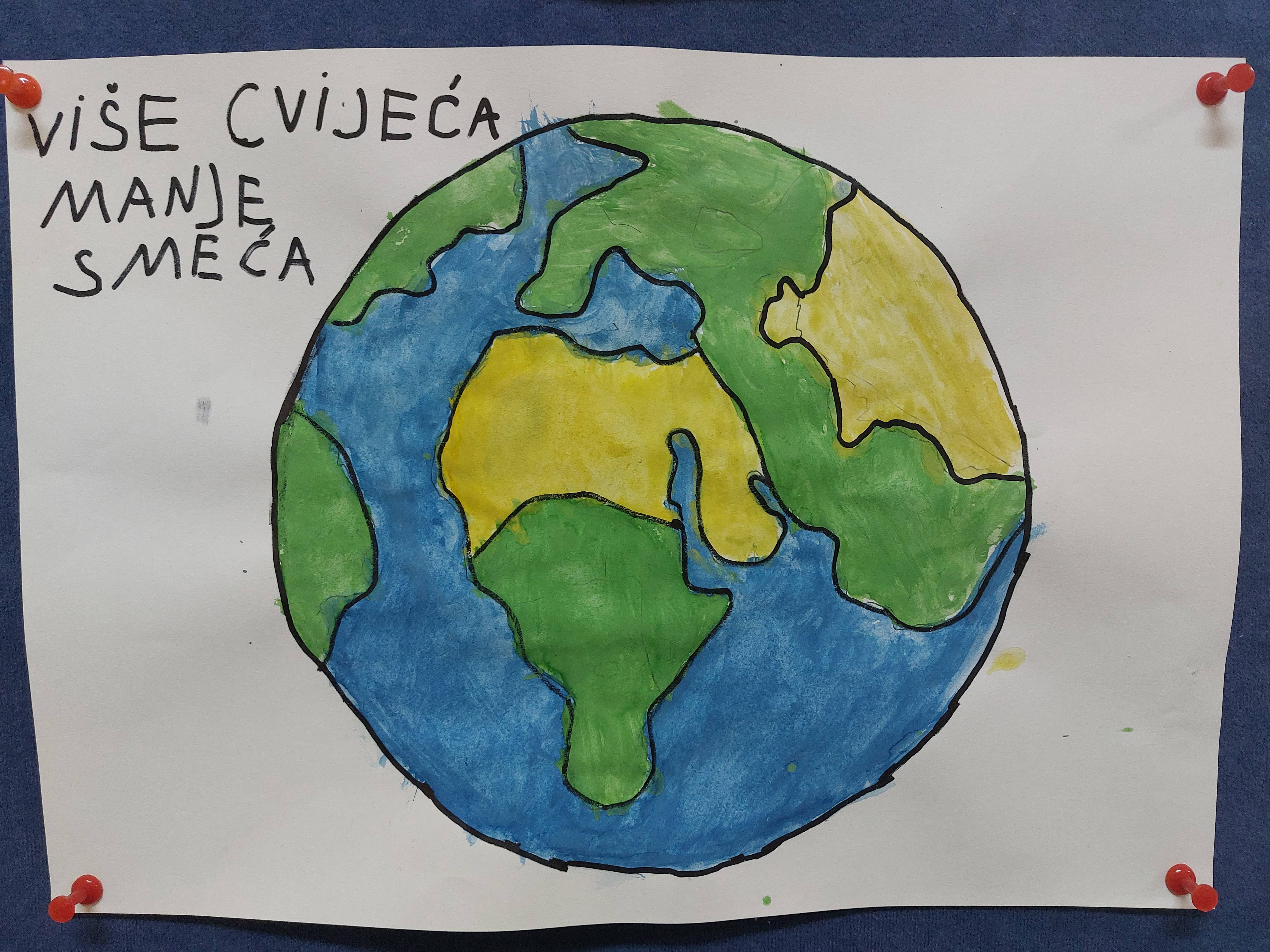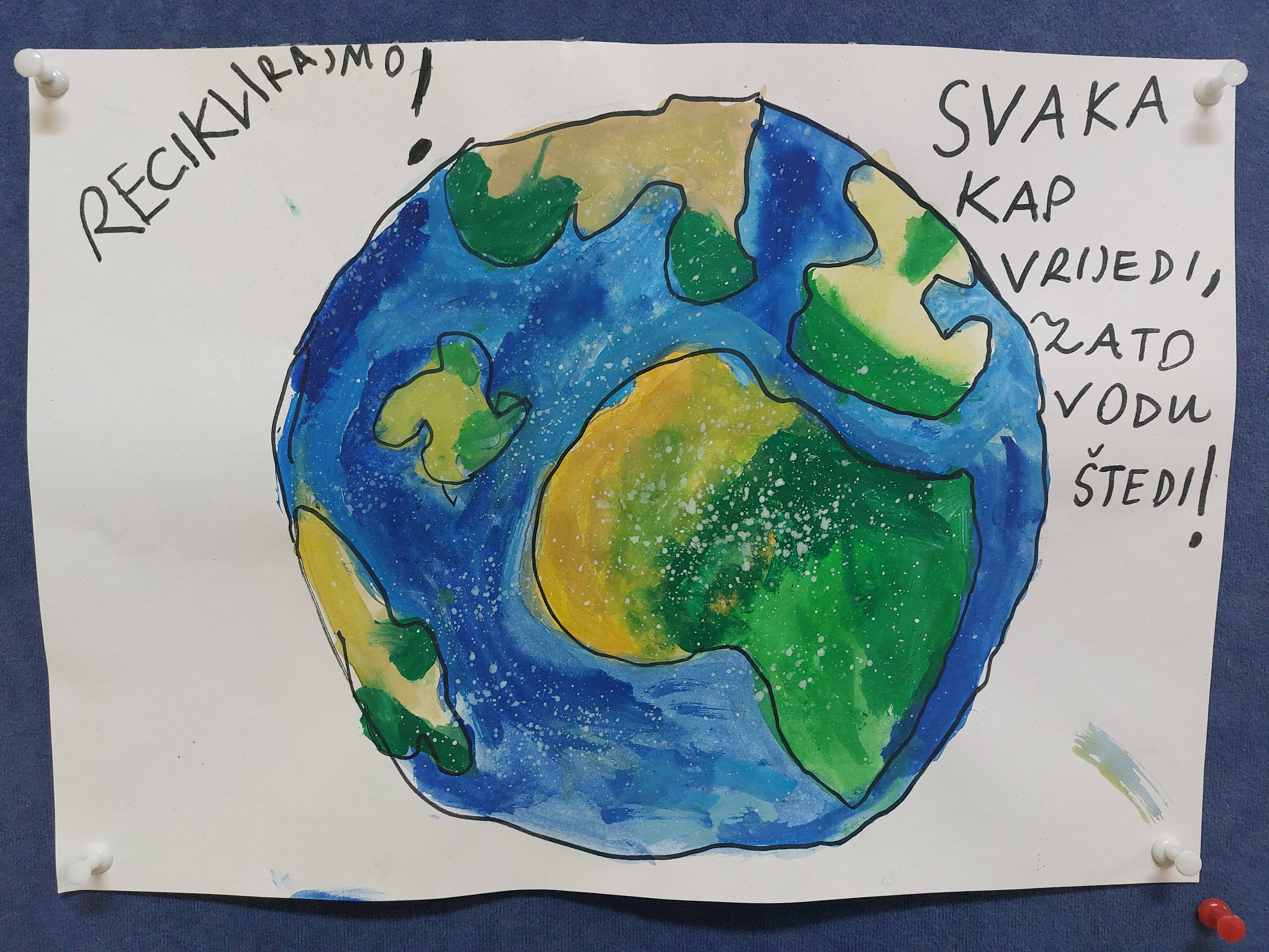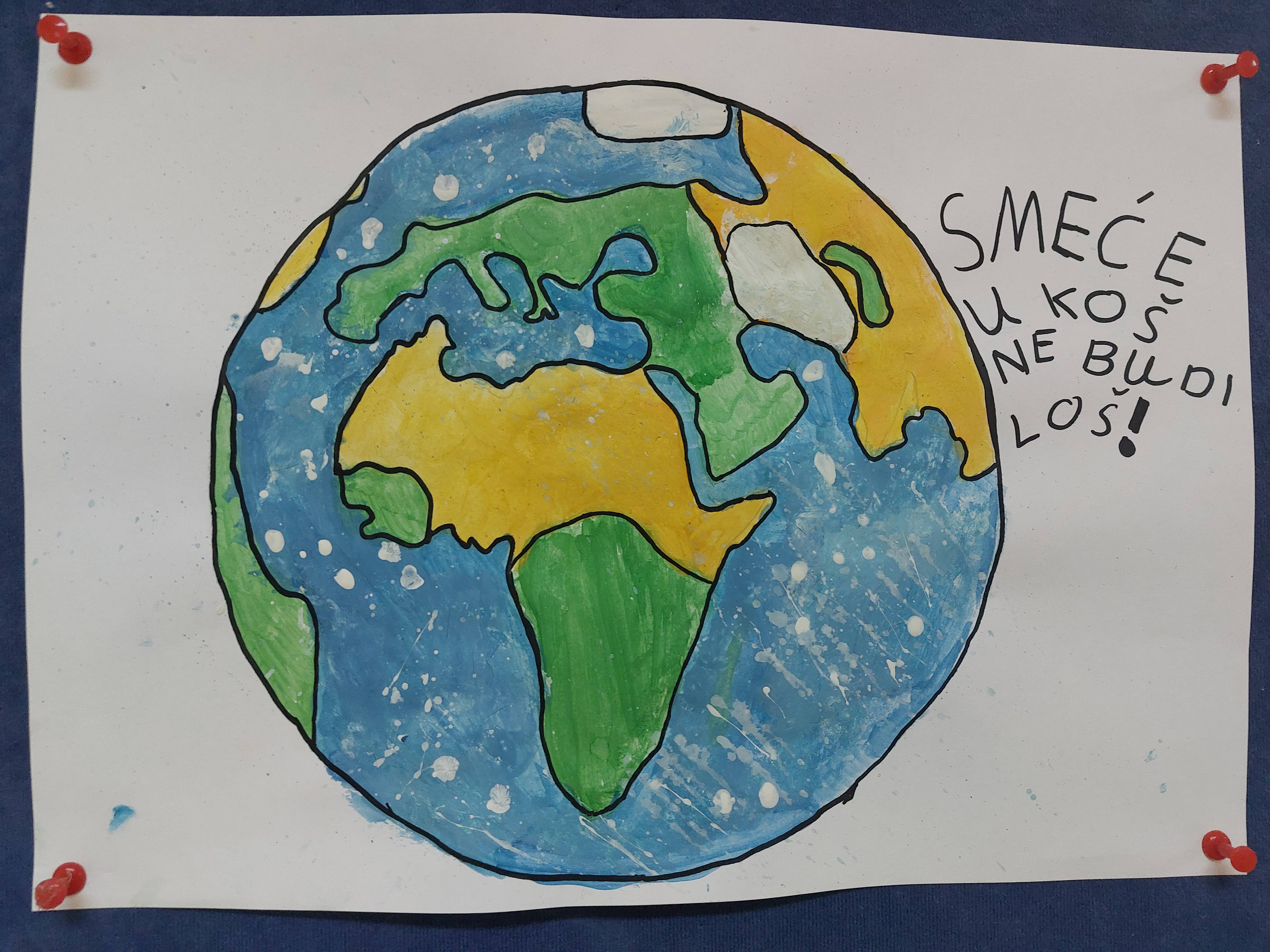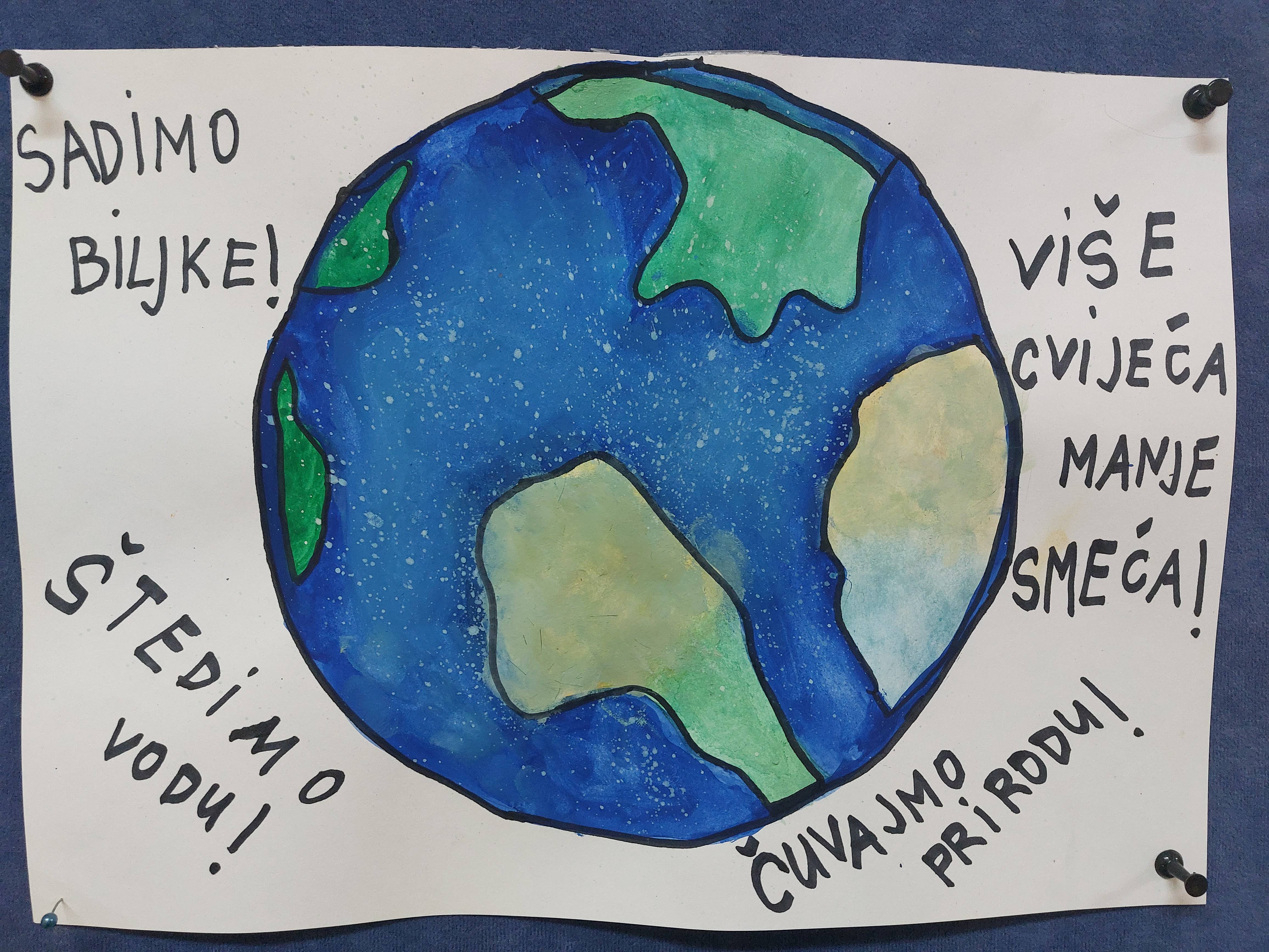 Na likovne radove učenici su napisali prigodne eko-poruke vezane uz Dan planeta Zemlje.