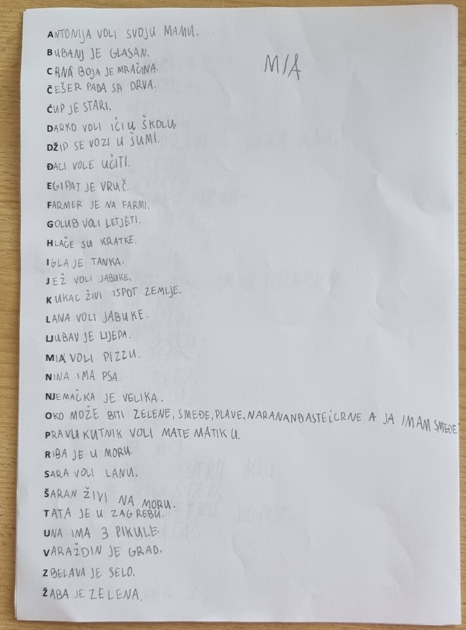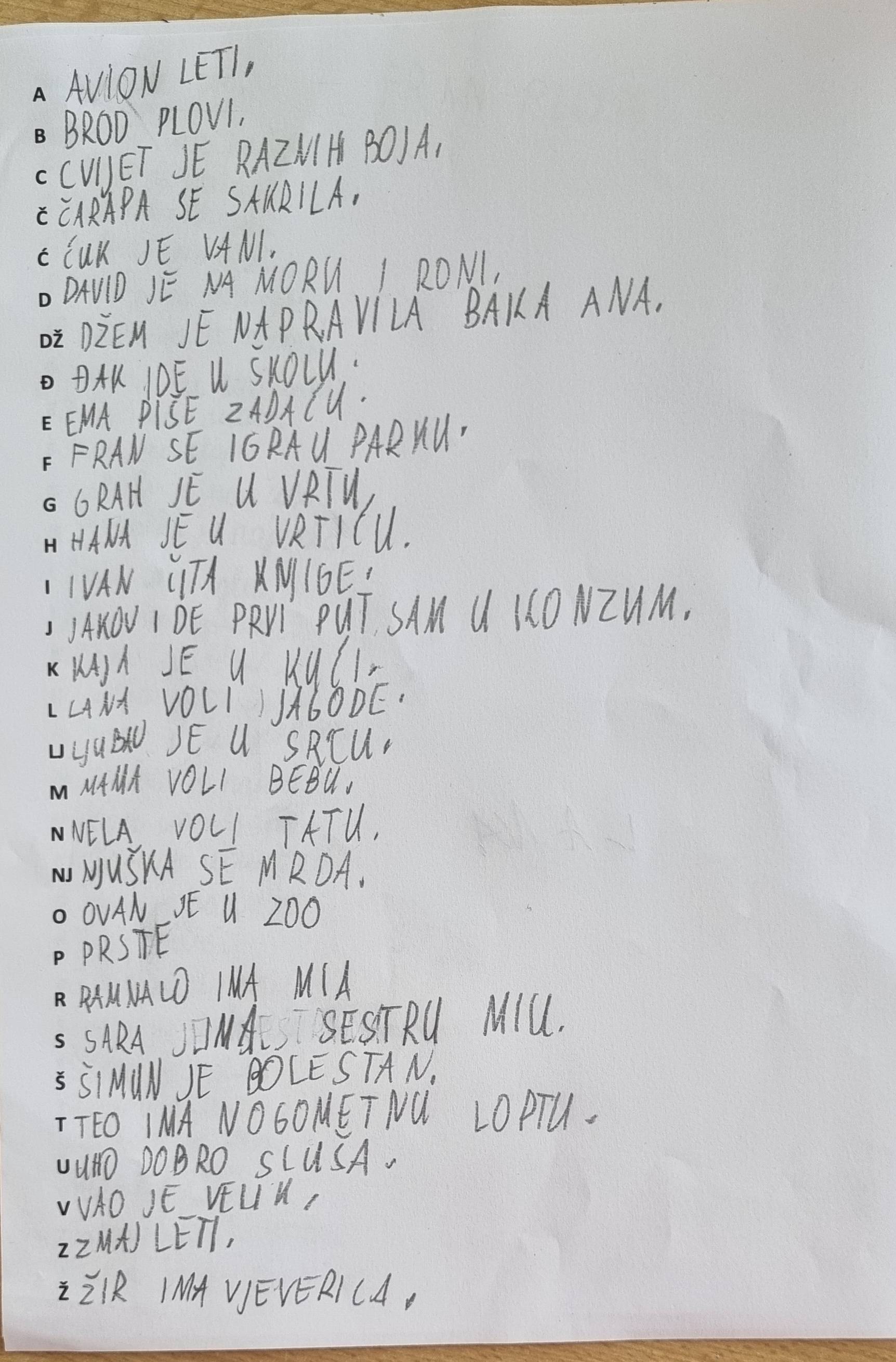 Zadatak je bio napisati jednu rečenicu koja počinje određenim slovom abecede.