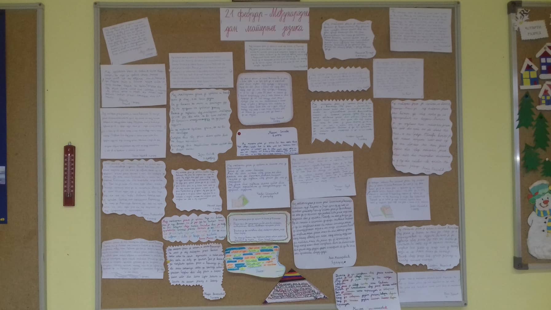 Učenici naše škole u kojoj se nastava odvija na srpskom jeziku i ćiriličkom pismu, imali su zadatak da napišu nekoliko rečenica o svom maternjem jeziku, da odgovore na pitanja zašto je njima njihov maternji jezik važan, zašto je važno da ga čuvaju i na koji način bi ga sačuvali. Svoje odgovore su uredno prepisali na papire, ukrasili i okačili na pano.