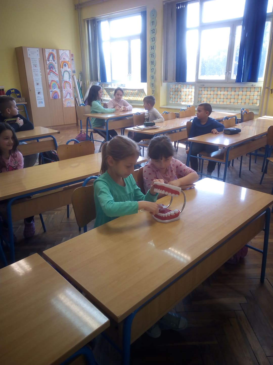 U prvom su razredu ispred Doma zdravlja u utorak, 19.2.2019. gostovale dve Zubić Vile: dr dent med Gordana Jeremić i med sestra Sonja Živanović. Obzirom na to da u ovom uzrastu deca gube mlečne i dobijaju trajne zubiće naše gošće su posebnu pažnju deci skrenule na pravilnu higijenu zuba. Ponovili smo koliko često i kada zapravo treba prati zube, te koliko dugo. Na modelu zuba sa velikom četkicom smo pokazali i provežbali kako se pravilno drži i postavlja četkica u odnosu na zube, kako kontrolisati stisak, te da su od svih najvažniji kružni pokreti četkicom.