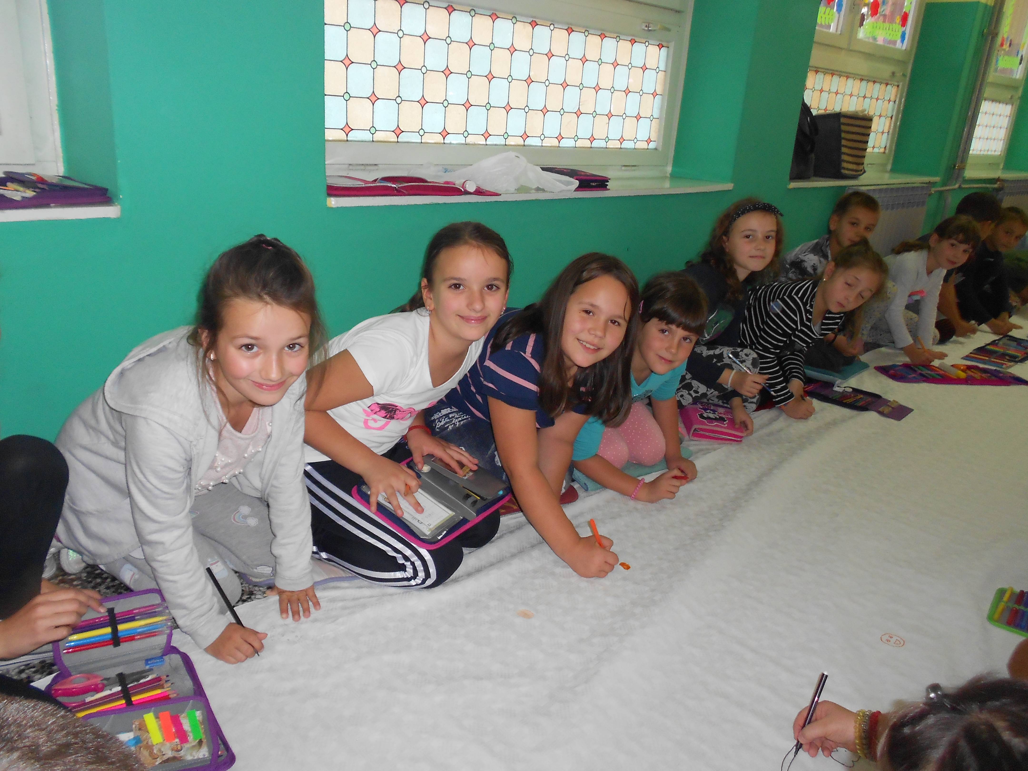 Prva puna nedelja u oktobru službeno nosi naziv Dečija nedelja, iako se mi trudimo da svaka nedjelja u našoj školi bude dečija. Učenici i učiteljice razredne nastave već je tradicionalno obeležavaju igrama na školskom igralištu te crtanjem kredama po asfaltu. Ove godine smo se odlučili za crtanje na velikom, zajedničkom papiru. Učenici su sedeli jedan do drugoga te prenosili svoje šarene misli bojicama na zajednički rad. Na kraju smo dobili veliku sliku punu šarenih crteža i poruka prijateljstva.