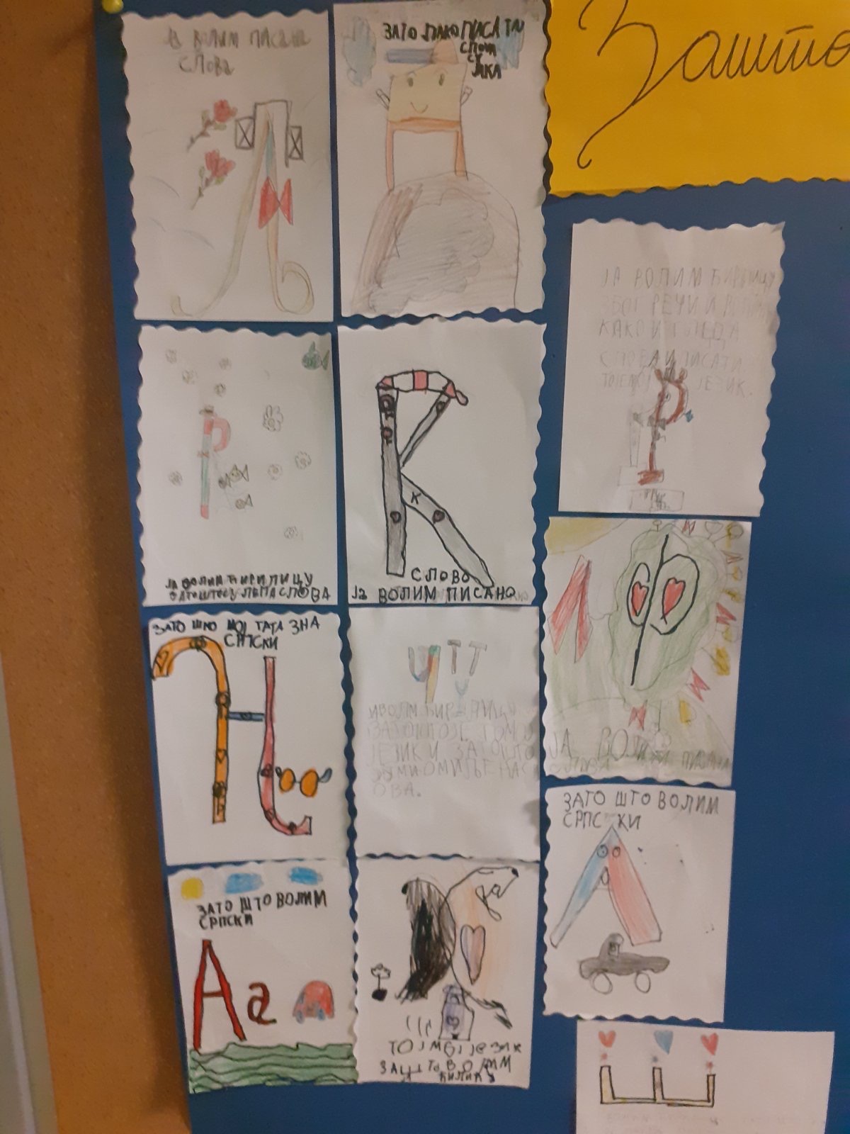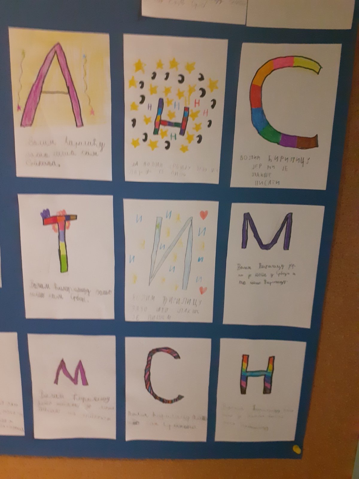 Bilo je vrlo zanimljivih razloga i pogleda na naš maternji jezik i ćiriličko pismo. Završne radove svakog učenika lepili smo na zajednički plakat kojeg smo izložili u hol naše škole.