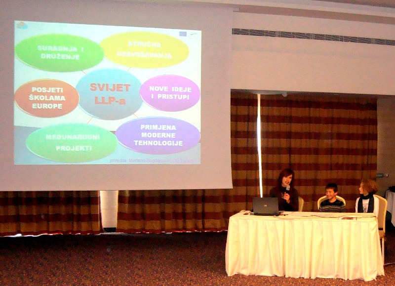 Svi oni koji dolaze sa područja cijele Dalmacije, a zainteresirani su za uvođenje inovacija i primjenu informacijsko-komunikacijske tehnologije u nastavi, kao i za primjenu Programa za cjeloživotno učenje, okupili su se 7. prosinca u hotelu Lav u Splitu, na Infodanima Agencije za mobilost i programe EU. Kako se o radu i primjeni ovog programa u našoj školi već naveliko govori i piše u cijeloj Hrvatskoj, a išire; djelatnici Agencije pozvali su učiteljicu Marlenu Bogdanović, kao i njene učenike Marka Brigića i Vanessu Vanu Rogga, kao svoje gost-predavače,da pred auditorijem od oko 200 zainteresiranih djelatnika sa područja obrazovanja, prenesu svoja iskustva i iznesu primjere iz prakse. Nakon dvadesetominutne prezentacije(možete je preuzeti sa stranica Agencije), svi okupljeni iskazali su svoje oduševljenje i čestitali našim vrijednim učenicima i učiteljima. Vjerujemo da će mnogi, baš zahvaljujući našem nastupu, uključiti i svoje škole u ovaj hvale vrijedan projekt. Toga, 7. prosinca bilo je tako dobro dolaziti iz OŠ Tučepi! Brojni su čestitari poželjeli i sami raditi u našoj školi, ili barem upisati svoju djecu u ovu školu u kojoj se toliko polaže u pripremu učenika za život u 21. stoljeću.