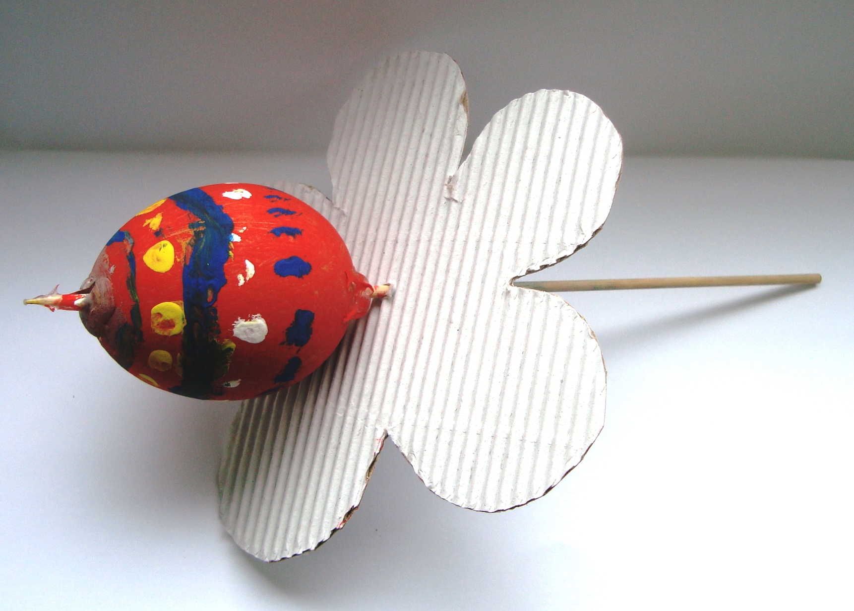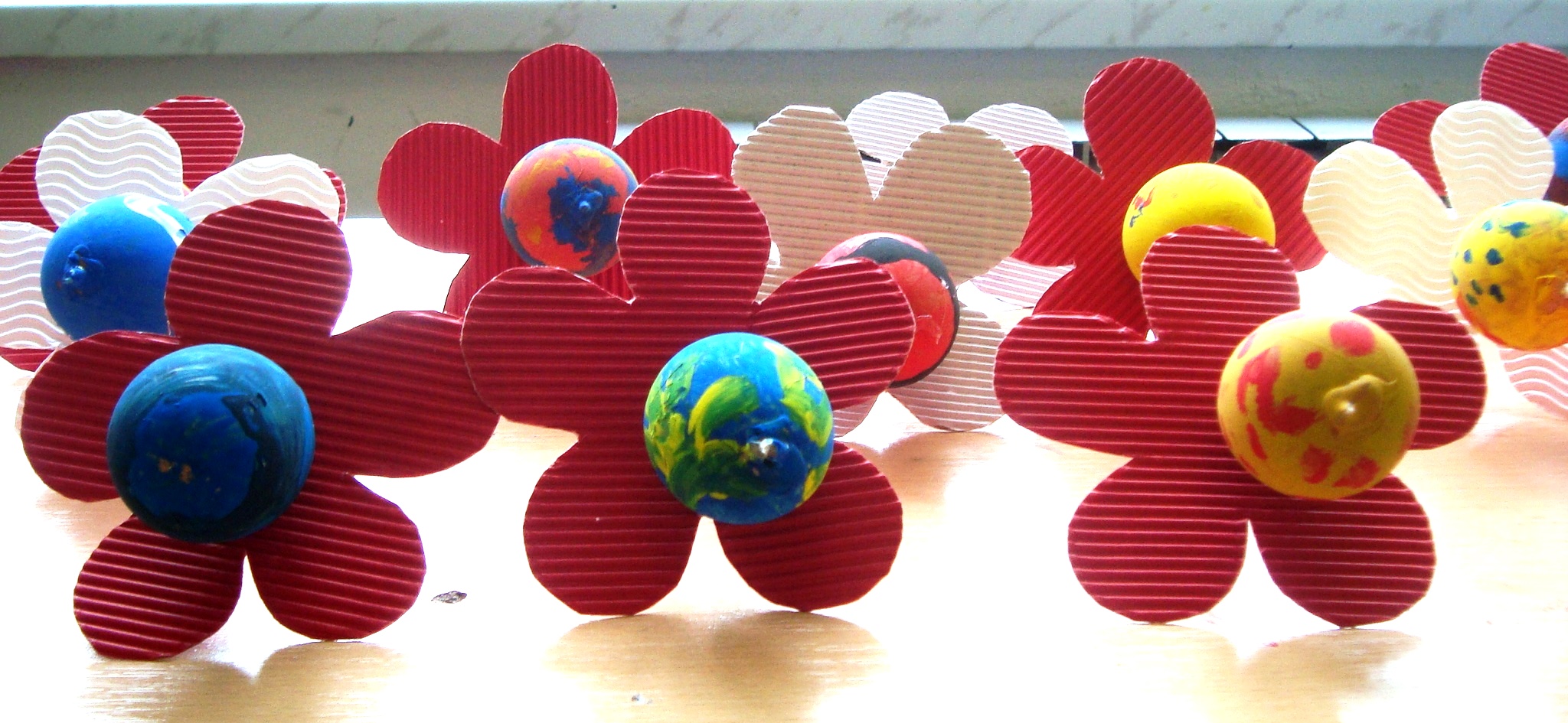 Obojane, šarene pisanice pričvrstili su na štapić, a kao podlogu su koristili cvjetiće izrezane od raznobojnih kartoncina.