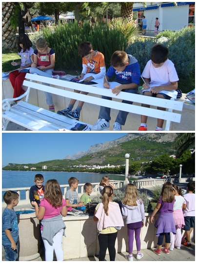 Što se tiče matematike, bilo je malo problema oko pisanja, ali snašli smo se ! Skupa smo sastavljali zadatke, a svi su bili na temu naše okoline ( ribe, kamenčići, gosti, hoteli… ) pa je i pismeno množenje izgledalo puno lakše, nego u razredu. Na kraju smo se i počastili i to graničarima na neobičnom terenu, ispred lučice!