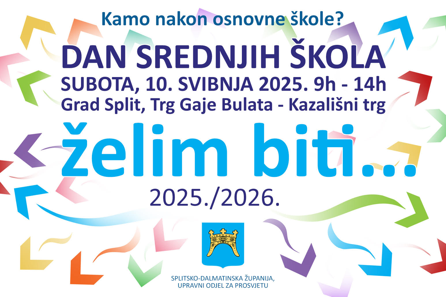 Manifestacija "Dan srednjih škola Splitsko dalmatinske županije" će se održati u subotu, 10. svibnja 2025. od 9:00 do 14:00 sati na prostoru Kazališnog trga – Trga Gaje Bulata, na platou ispred zgrade Hrvatskog narodnog kazališta u Splitu.