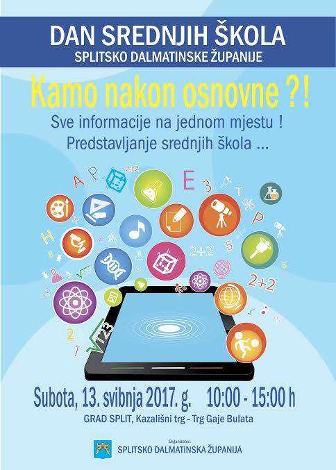Obavijest za sve, a posebno za zainteresirane učenike 7. i 8. razreda i njihove roditelje. Manifestacija "Dan srednjih škola Splitsko-dalmatinske županije 2017. godine" će se održati u subotu, 13. svibnja 2017. godine od 10:00 do 15:00 sati na prostoru Kazališnog trga – Trga Gaje Bulata, odnosno na platou ispred zgrade Hrvatskog narodnog kazališta u Splitu. Svečano otvaranje predviđeno je s početkom u 11 sati.