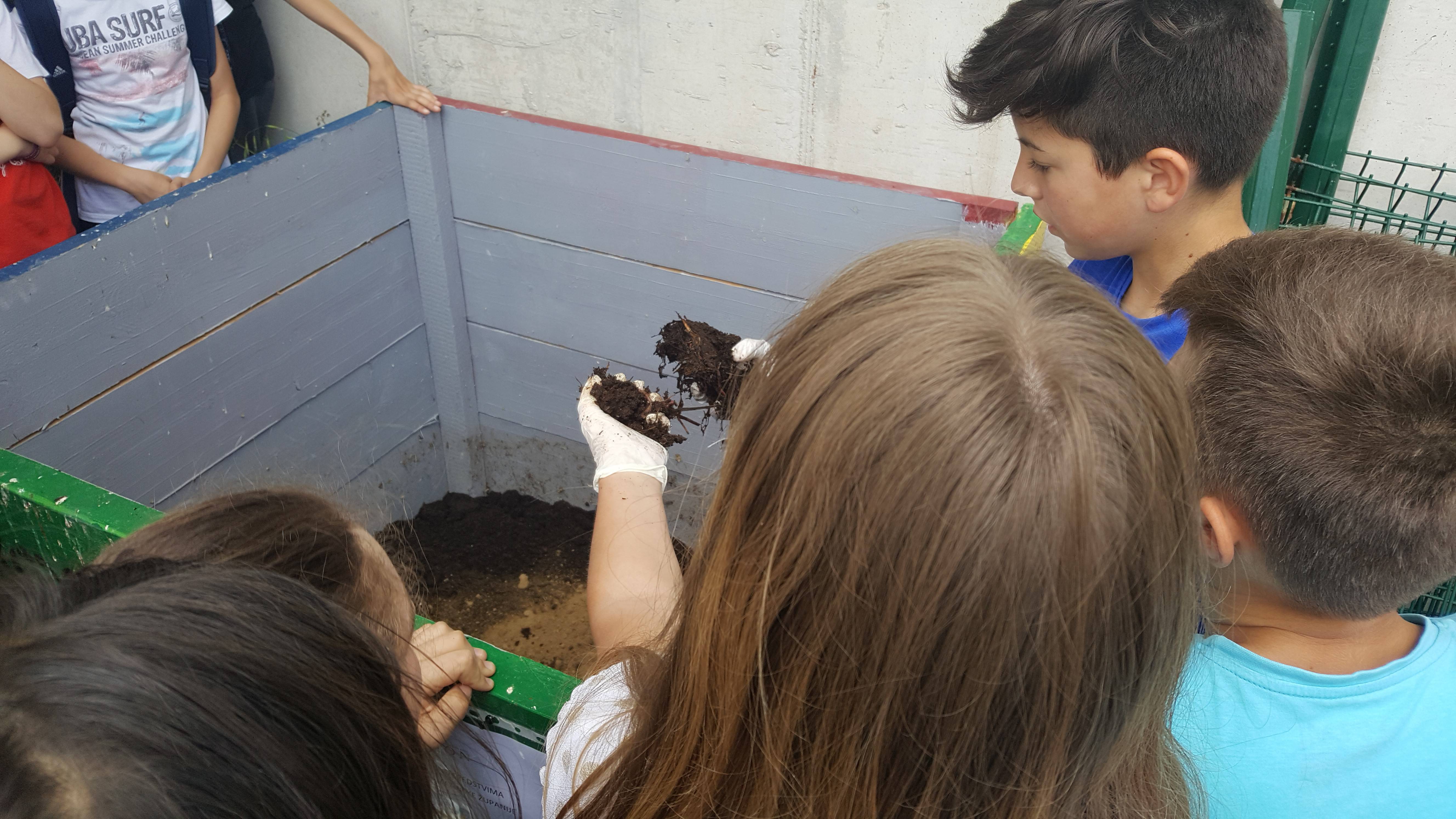 Zahvaljujući spomenutoj udruzi dobili smo drvenu kompostanu u kojoj smo započeli proces kompostiranja. To je nezaobilazni postupak organskog vrta. Kompost znači hranu za naš vrt, osim toga, na taj način se rješavamo vrtnog i kuhinjskog otpada i kao rezultat dobivamo humus koji je bitan za naše biljke. Kako bi se proces kompostiranja ubrzao i humus bio kvalitetniji dobili smo i kalifornijske gliste koje su postale stalni stanovnici našeg komposišta.