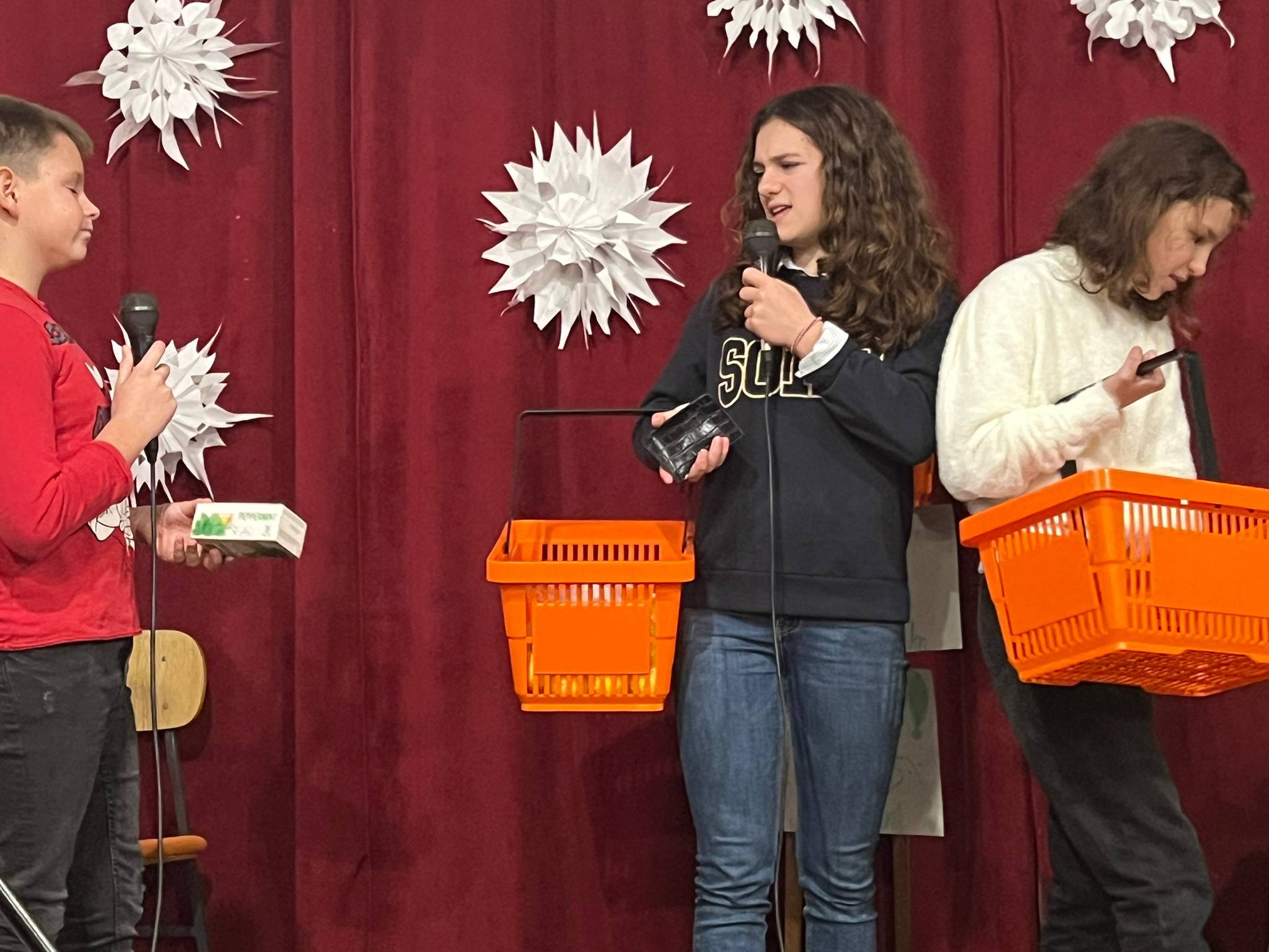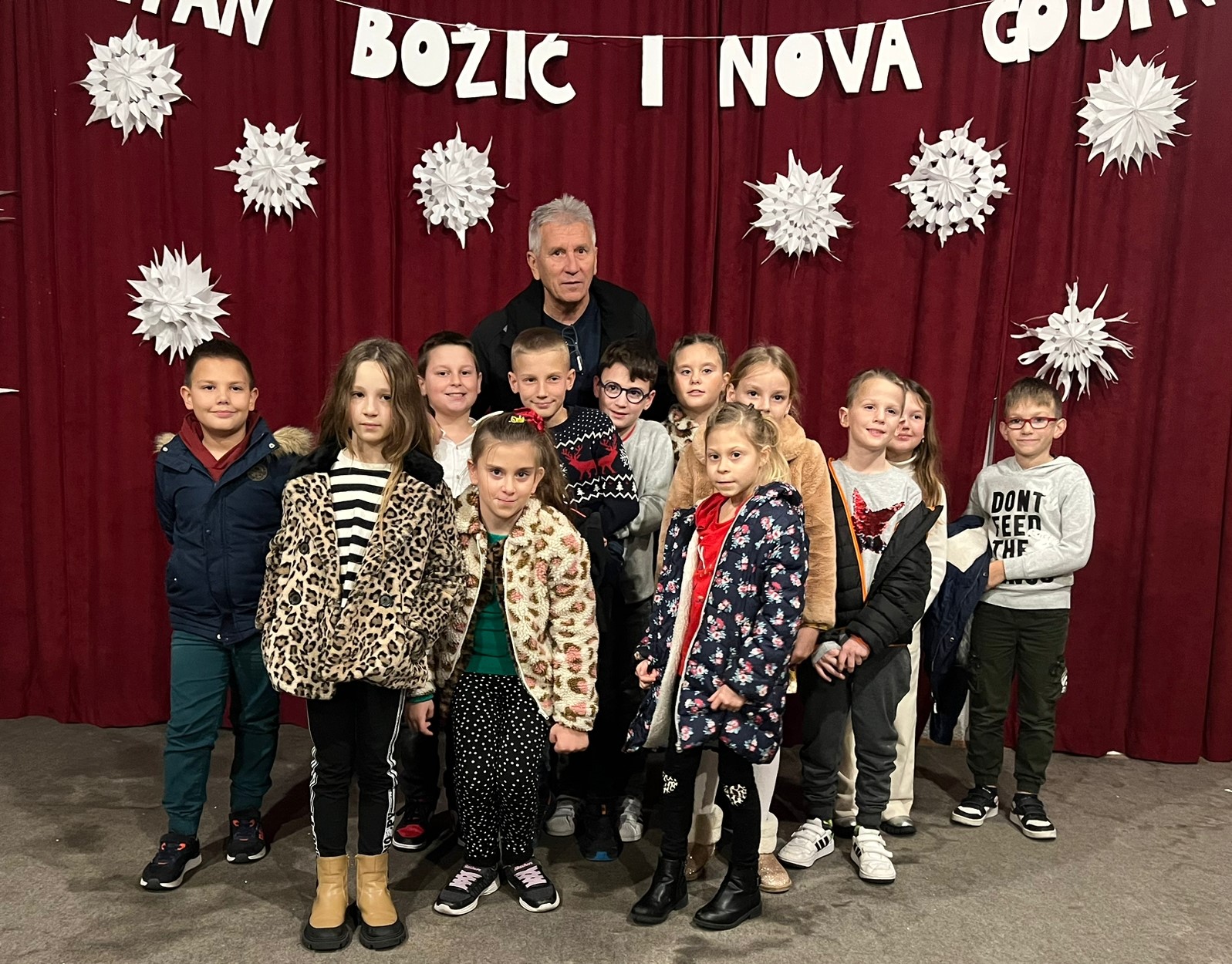 Za priredbu su zaslužni: učenici i učitelji razredne nastave sa svojim glazbenim točkama, voditeljica dramske sekcije Ljubica Carević sa igrokazom dramske skupine "Milijunti kupac" učenika 5. i 6. razreda, Marin Erceg učitelj glazbene kulture sa nizom prigodnih pjesama školskog zbora (učenici 5. - 8. razreda) i solo točkama učenika 5. i 6. razreda (Petre Brbić, Tome Bušelića, Lucije Brbić i Mije Šimić), te voditeljica cijele božićne priredbe vjeroučiteljica Marina Šimić, koja je sa učenicima 7. razreda pripremila igrokaz "Točno vrijeme Isusovog rođenja".