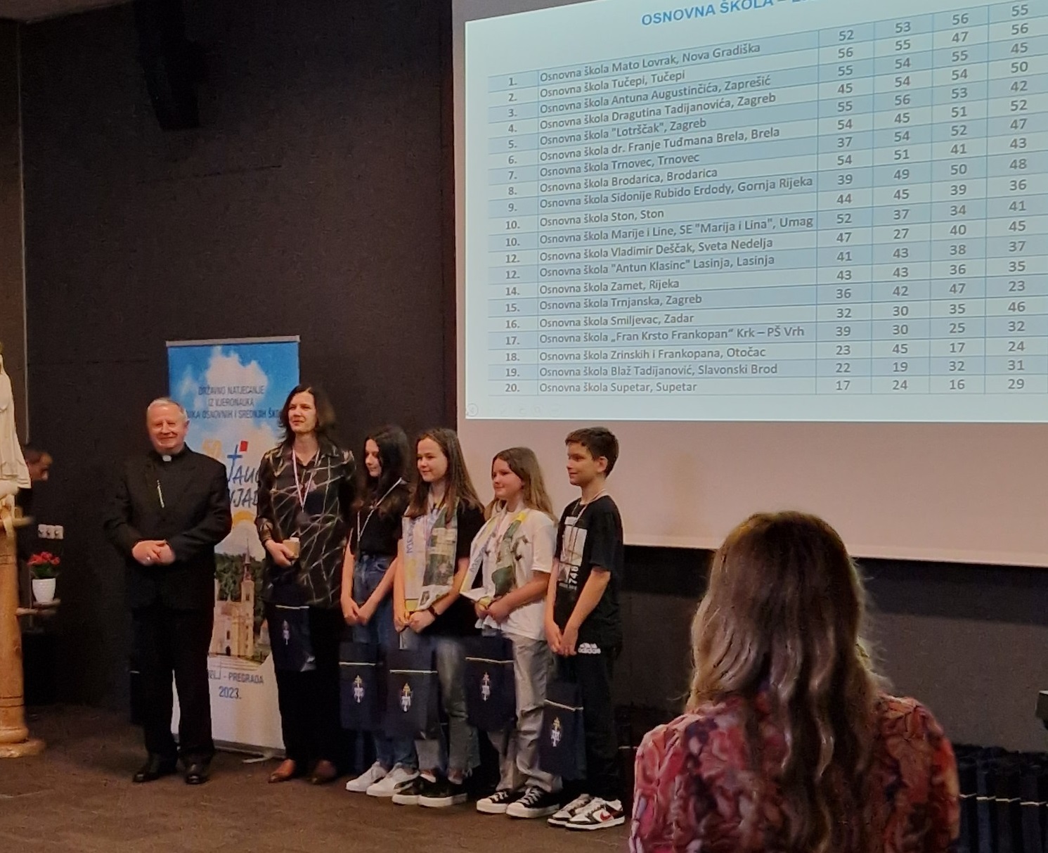 Jako smo ponosni što je na 50.-toj jubilarnoj Vjeronaučnoj olimpijadi – državnom natjecanju iz Vjeronauka naša ekipa, vjeroučenici: Marina Bebek, 7. r., Laura Bebek, 6. r., Nada Šarić, 6. r. i Frano Mravičić, 5. r., zajedno s vjeroučiteljicom Marinom Šimić osvojila 2. mjesto.