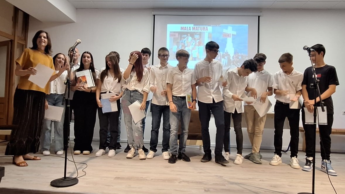 Na novouređenoj pozornici dvorane su se uz njih, razrednicu i ravnatelja pridružili preostali učenici: Marin Brbić, Mijo Čobrnić, Luce Čović, Magdalena Jurić, Benedikt Mravičić, Franko Mravičić, Marin Vidić i Jure Vidaković, među ostalim i naš ministrant.
