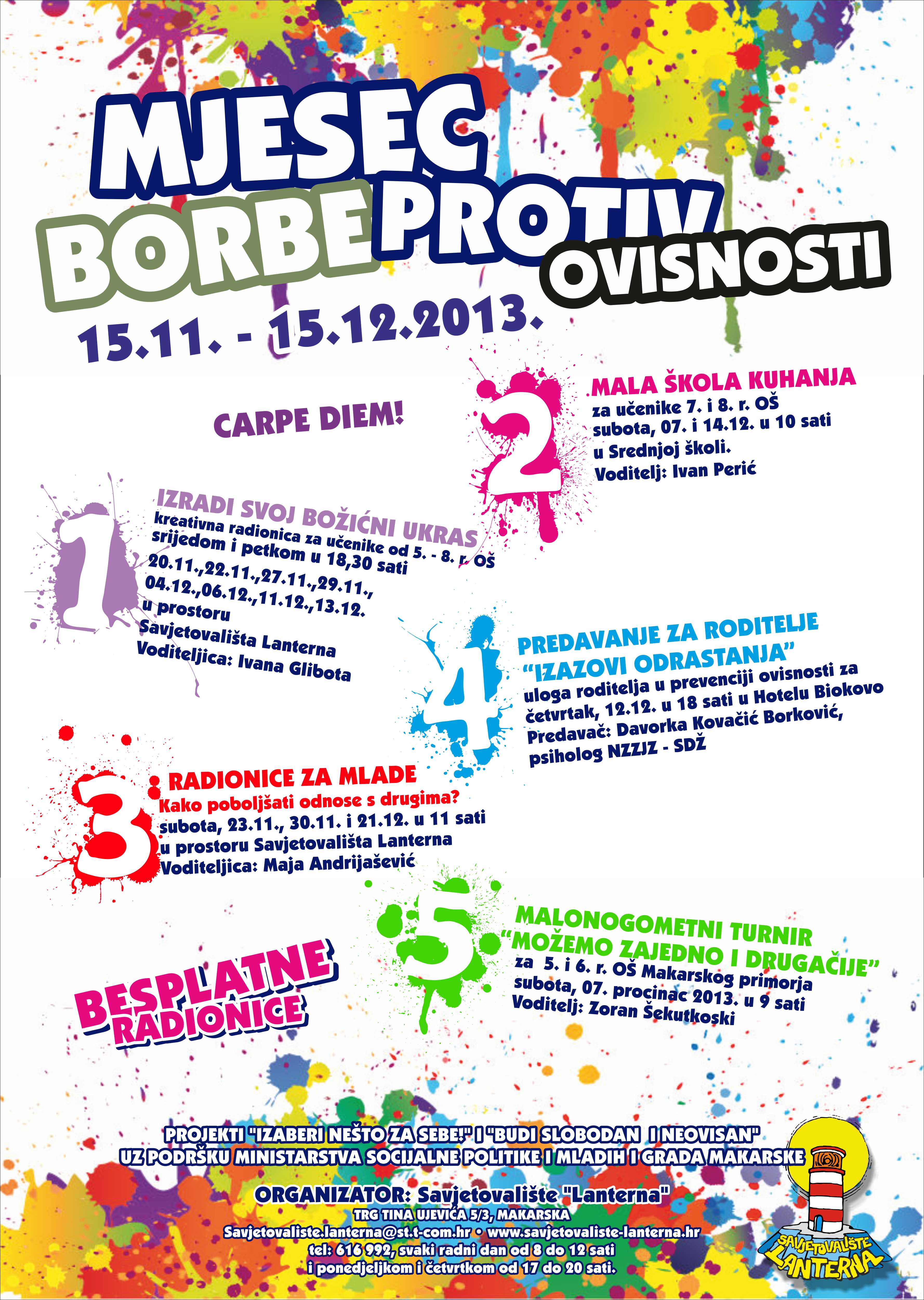 Kroz studeni i prosinac u organizaciji savjetovališta Lanterna iz Makarske, a uz potporu Ministarstva socijalne politike i mladih i Grada Makarske u skolpu projekta "zaberi nešto za sebe" i "Budi neovisan" pozvani su učenici, roditelji i učitelji na radionice, turnir i predavanja.