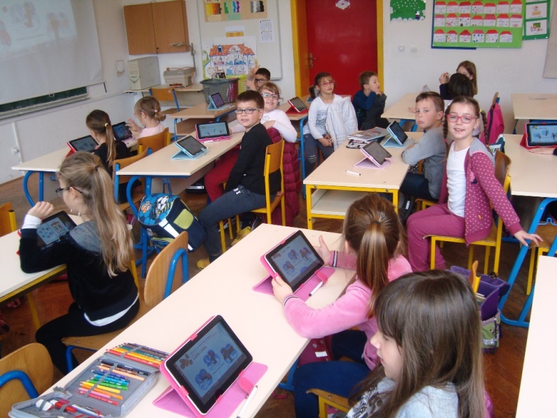 Bilo je lijepo vidjeti kako su učenici suradni i kako pomažu savjetima jedni drugima. Zatim smo naučili kako se aplikacija otvara, koje gumbe imamo na raspolaganju i kako se njima služiti. Bilo je zgodno "šarati" po udžbenicima: zaokruživati i podcrtavati - kada smo saznali da se sve može lako obrisati jednim klikom! Kako slova na pojedinoj stranici nebi bila presitna, naučili smo da se dvostrukim klikom stranice povećavaju i rad olakšava. Čestim izmjenama aktivnosti: rad na tabletima, u bilježnicama, boravka na zraku i igrama, pet školskih sati brzo je prošlo. Od ovog ponedjeljka učenici više ne moraju u školu donositi "papirnate" udžbenike, već samo bilježnice i radne bilježnice. Jednom u mjesecu imat ćemo RETRO DAN - dan kada ćemo donijeti naše "stare - papirnate" udžbenike i njima se služiti kao što smo to činili "nekada davno". Kako su digitalni udžbenici u školi, čitat ćemo, učiti i izrađivati zadaće služeći se "papirnatim" udžbenicima kod kuće jer ćemo svakodnevno u bilježnice zapisivati stranice na koje kod kuće treba obratiti posebnu pozornost. Sudeći prema reakcijama i iskazanom zadovoljstvu naših prvaša, čini se da će ovaj projekt sa korištenjem digitalnih udžbenika doživjeti pun uspjeh! Dragi prvaši, sretno u 21. stoljeću!