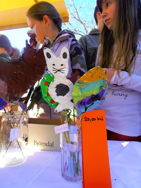 Boravak na otvorenom i sunčano jutro svima je prijalo. Kao i za svaki sajam i za ovaj su se jako potrudili učenici u izradi prigodnih uradaka. Okupljeni u zajedničkoj sekciji Vrijedne ruke, prvašići su nas obradovali proljetnim slikama, drugaši su pripremili i uredili ukrasne kutije, učenici trećeg razreda su obojali pisanice, a četvrtaši su radili uskrsne simbole. Učenička zadruga „Škrinjica“ i ovoga nas je puta iznenadila maštovitošću i kreativnošću svojih vrijednih članova. Na štandu se moglo vidjeti mnoštvo njihovih uradaka za koje je trebalo izdvojiti dosta vremena i truda. Tu su bili: mirisni platneni zečići punjeni lavandom, košarice od papira, jaja ukrašena quilling tehnikom, melem u prigodnim pakiranjima i vuneni zečići i pilići.