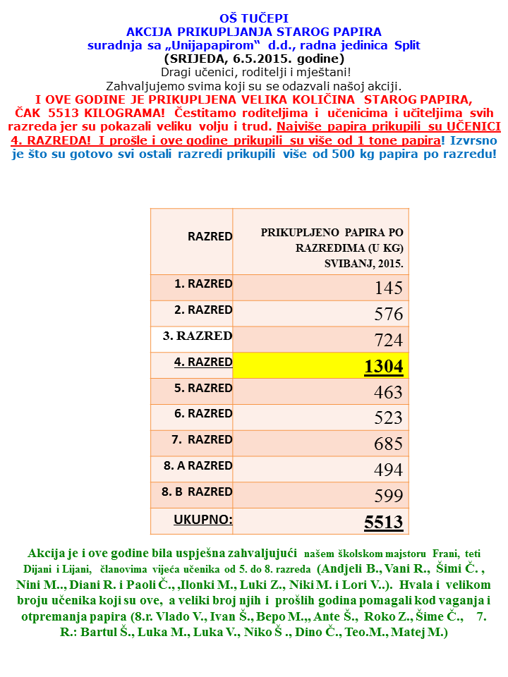 I ove godine prikupljena je velika količina staroga papira, čak 5513 kilograma! Čestitamo roditeljima, učenicima i učiteljima svih razreda jer su pokazali veliku volju i trud.