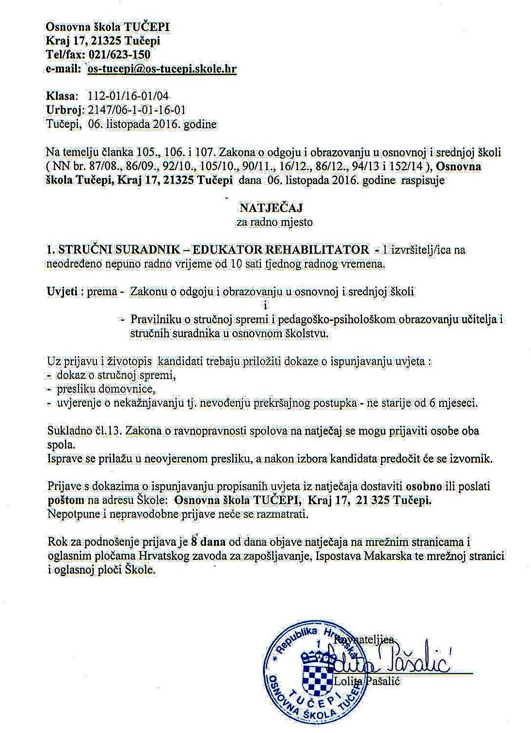 NATJEČAJ ZA RADNO MJESTO STRUČNI SURADNIK - EDUKATOR - REHABILITATOR