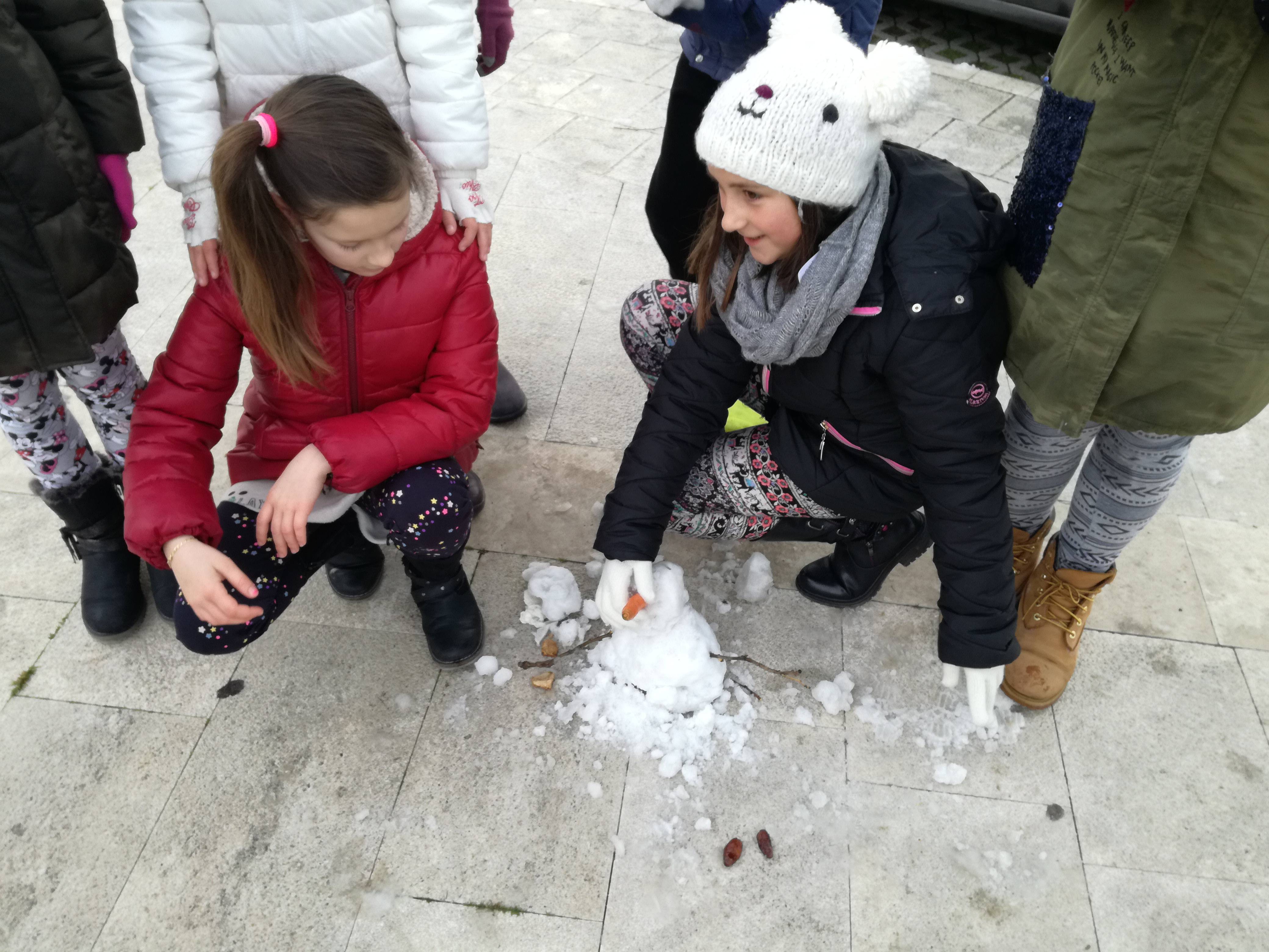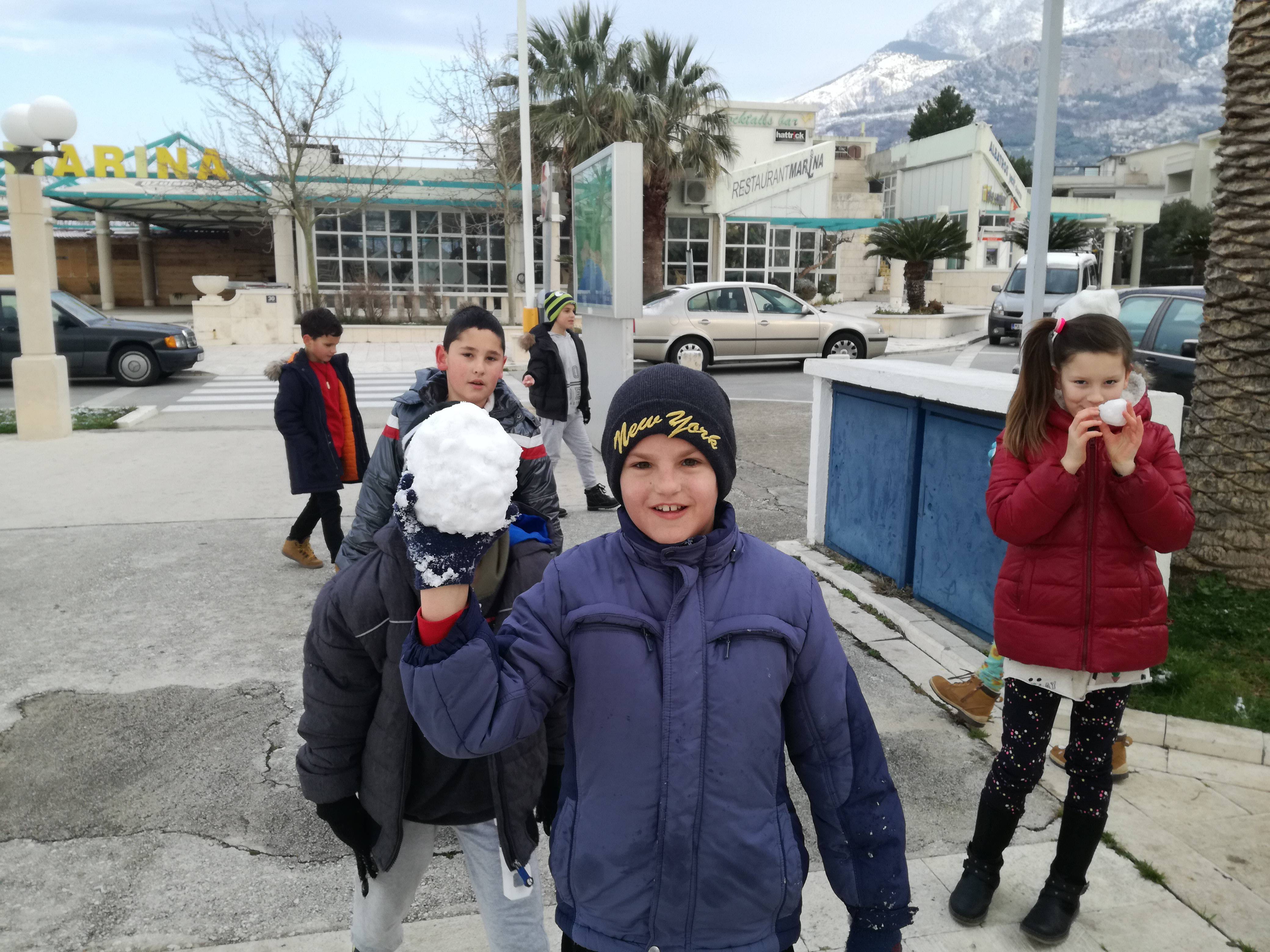Dočekali smo da da i u našim Tučepima padne bar malo snijega! Prošetali smo do Lučice, putem sakupljali snijeg sa automobila i zelenih površina. Kraj fontane pokušali smo napraviti snjegovića. Mrkvu za nos i datule za oči kupili smo u Konzuma. Radovali smo se i najsitnijim mrvicama snijega!Bilo je hladno, ali nam nije smetalo!