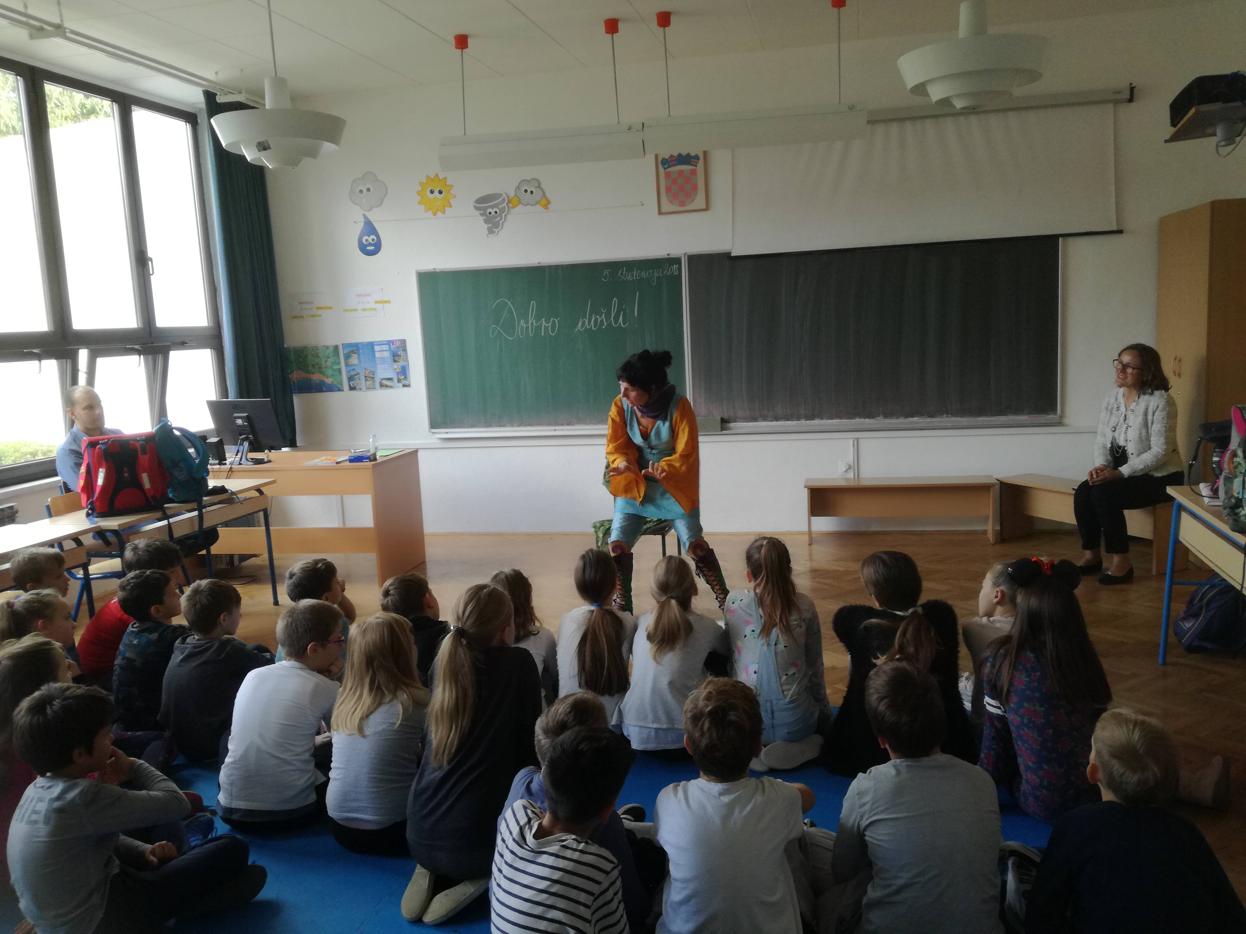 Pripovjedačica Margareta Peršić ispripovijedala nam je jednu priču o Jeleni Prekrasnoj. Dok je pripovijedala, dozivala je neke članove publike-djecu da glume u ulogama znatiželjnih baba, starih djedova, pjesnika, postolara, sluškinja(u dobrom smislu), patki, pataka, Ivanovog sluge i njegovih jedanaest prijatelja, kraljevića i njegove mlađe sestre, starijeg brata, Jelene Prekrasne. a i straca duge zlatne kose i srebrne brade. Bilo nam je divno! Voljela bih da dođe još puno puta u našu školu, ali ne znam baš koliko je to moguće.