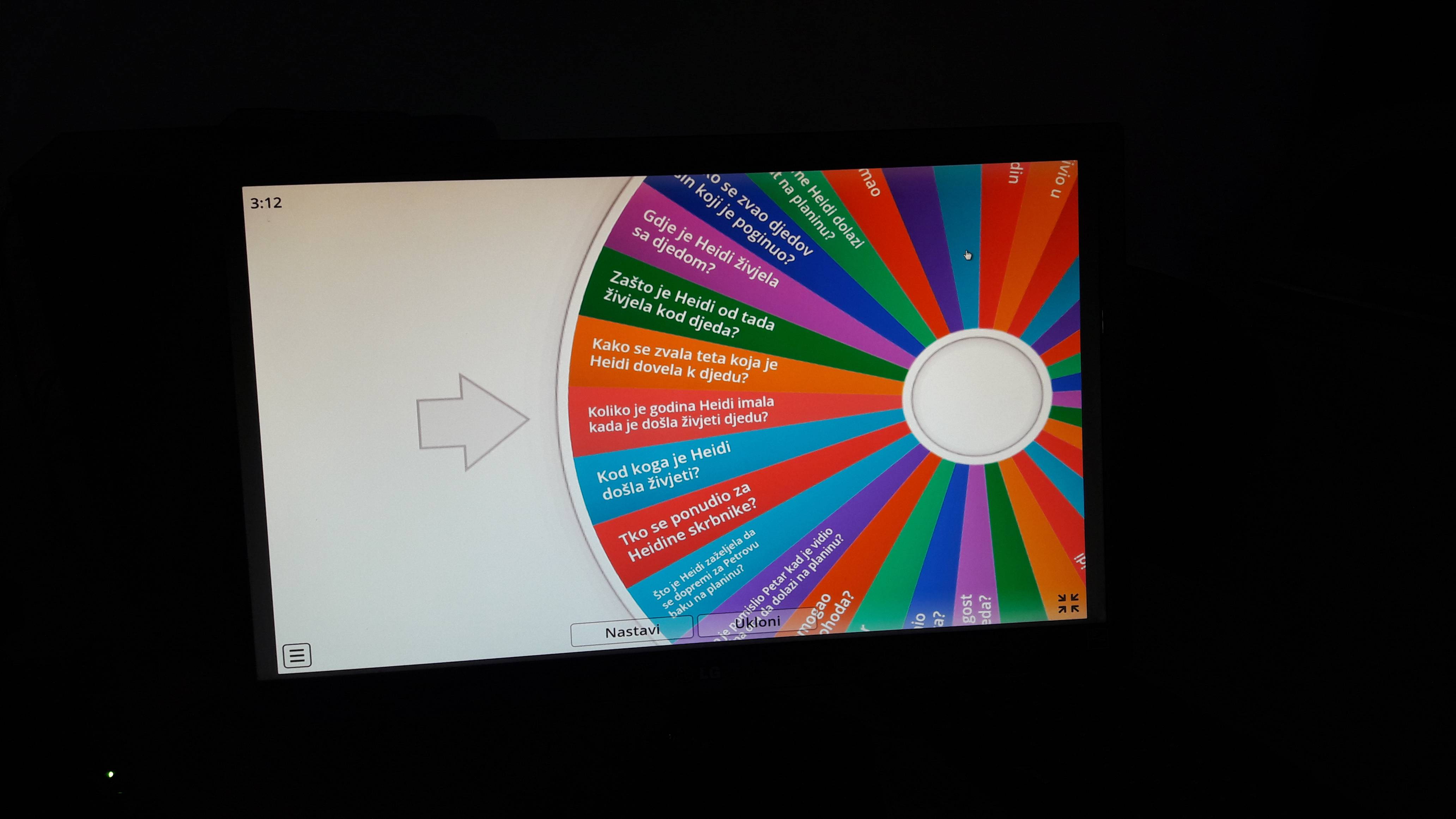 Kako bi lakše prodrli do današnje generacije gejmera, uzeli predah od olovke i papira i učinili nastavu zanimljivijom, koristili smo učenicima dobro poznati Wordwall - interaktivni sadržaj. Putem računala učiteljica zavrti kotač, a učenici su podijeljeni u dvije grupe. Nakon što se zaustavi kotač i knjižničarka pročita pitanje, javljaju se učenici koji znaju odgovor na postavljeno pitanje te dobivaju nagradne bodove ili im se oduzimaju bodovi ako ne znaju odgovor na postavljeno pitanje. Ova aktivnost, jednostavna i prilagođena učenicima, svima se svidjela. Učenici su pokazali znanje i razumijevanje pročitanog, a time i zaslužili sve pohvale te slatkiše.