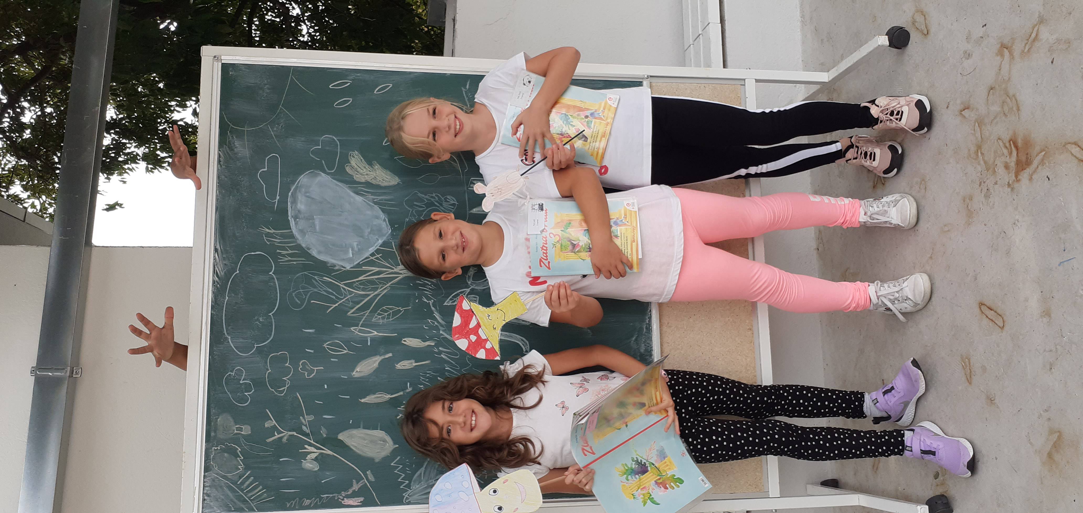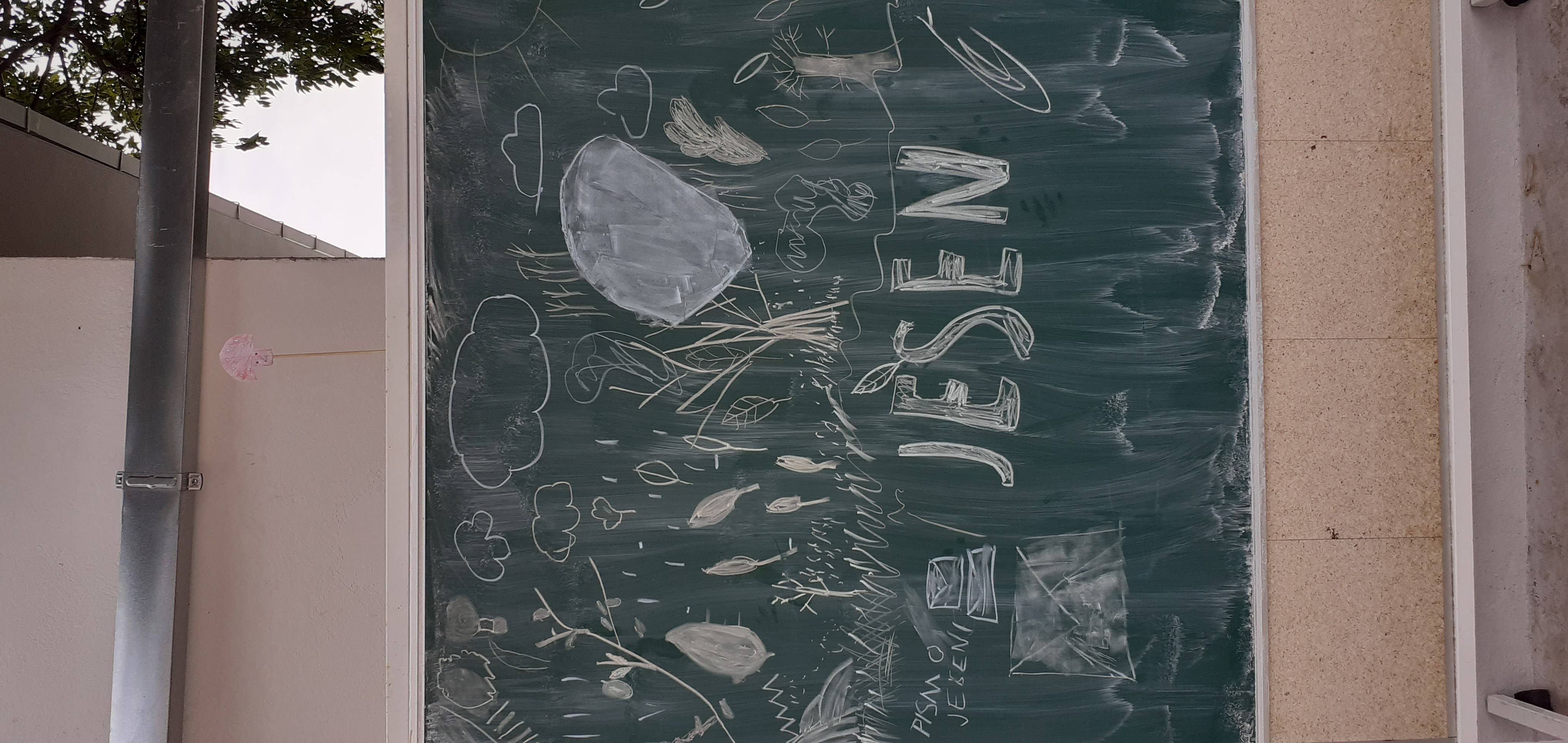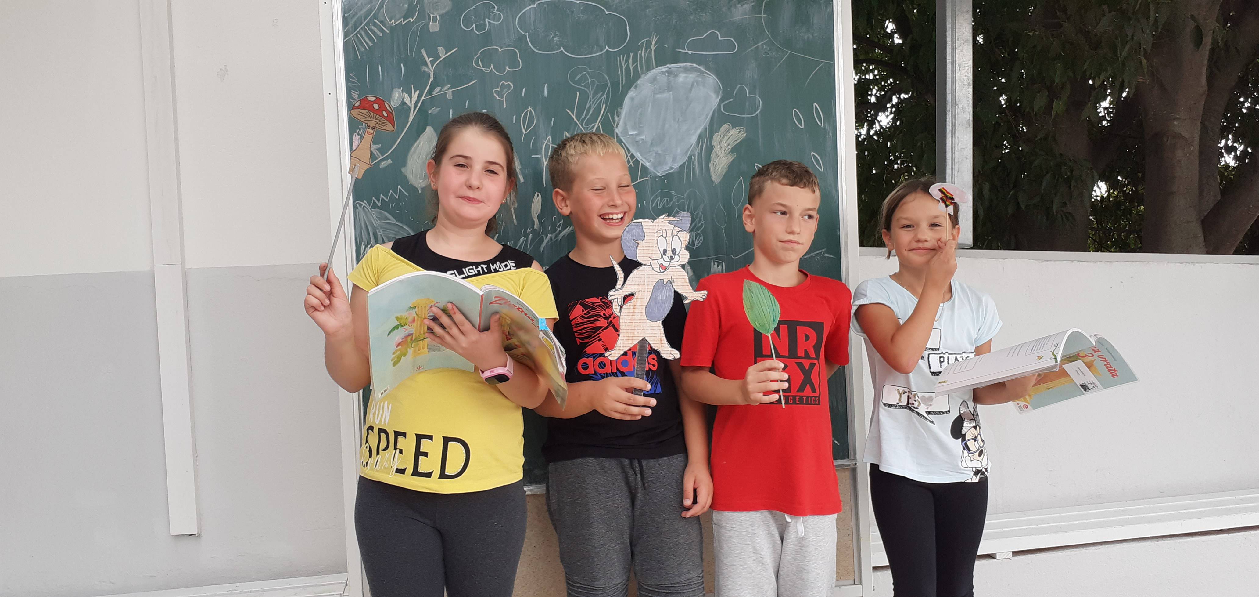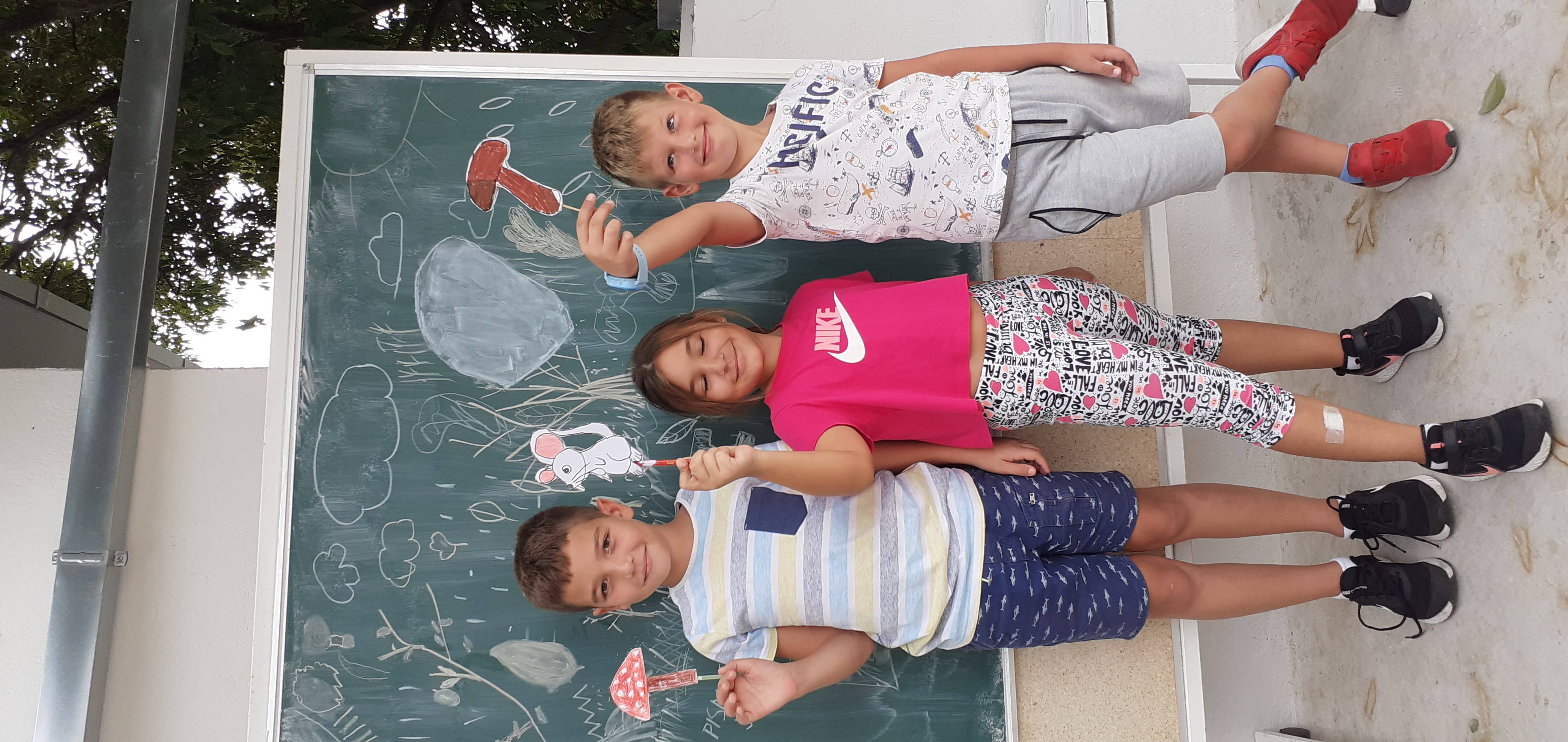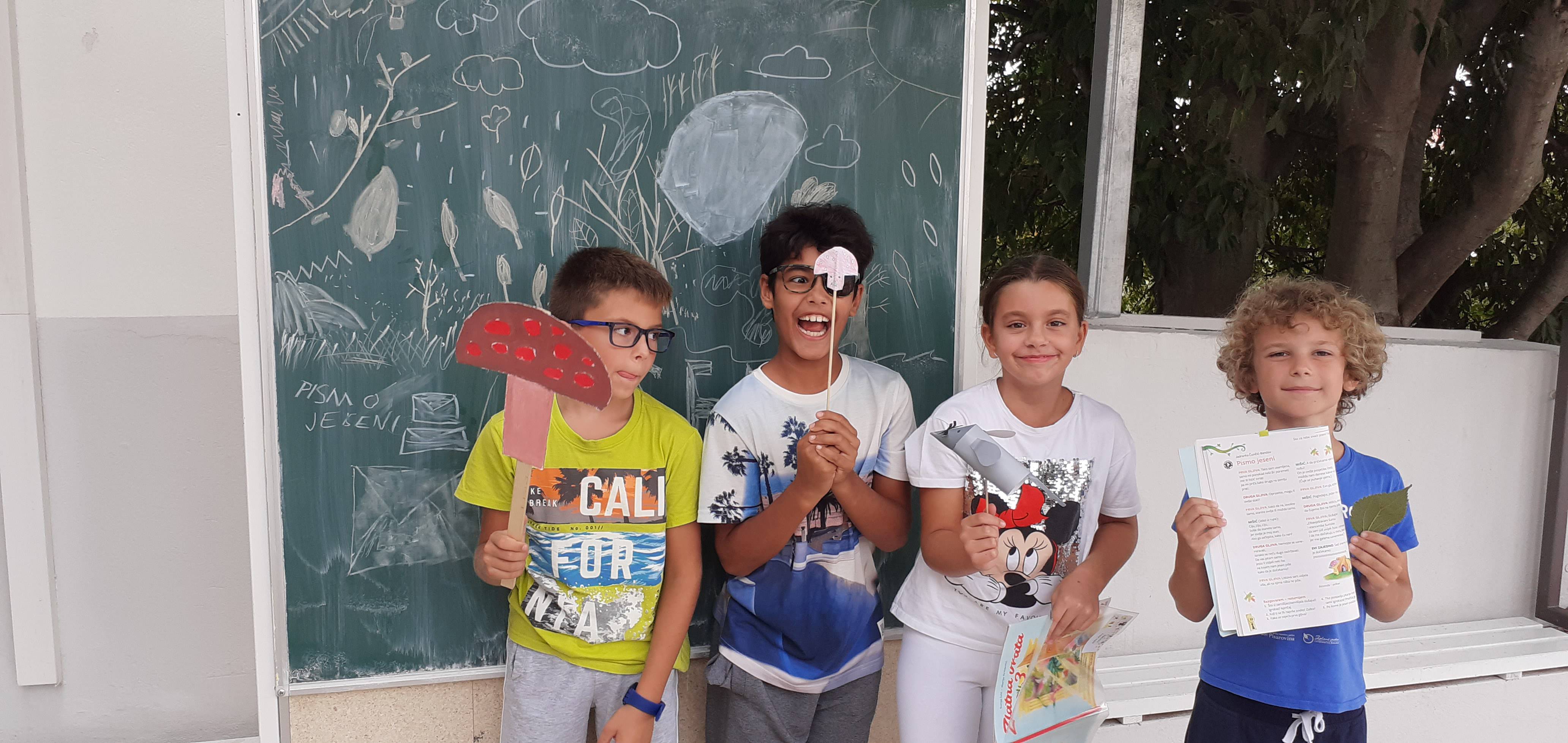 Bio je sunčan jesenski dan pa smo odlučili igrokaz izvesti na našoj terasi.Za pozornicu nam je poslužila školska ploča na kotačićima koju smo sami ukrasili jesenskim crtežima!