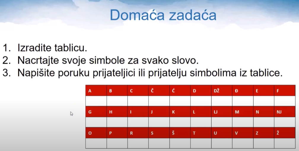 Povodom Europskog tjedna programiranja / kodiranja, uzmi kod učiteljice pripremljenu tablicu, izradi kodove (upiši simbole koji će zamjeniti slova) te s prijateljem koji ima istu tablicu izmjeni nekoliko kodiranih poruka. Samo ćete vi znati dekodirati poruke