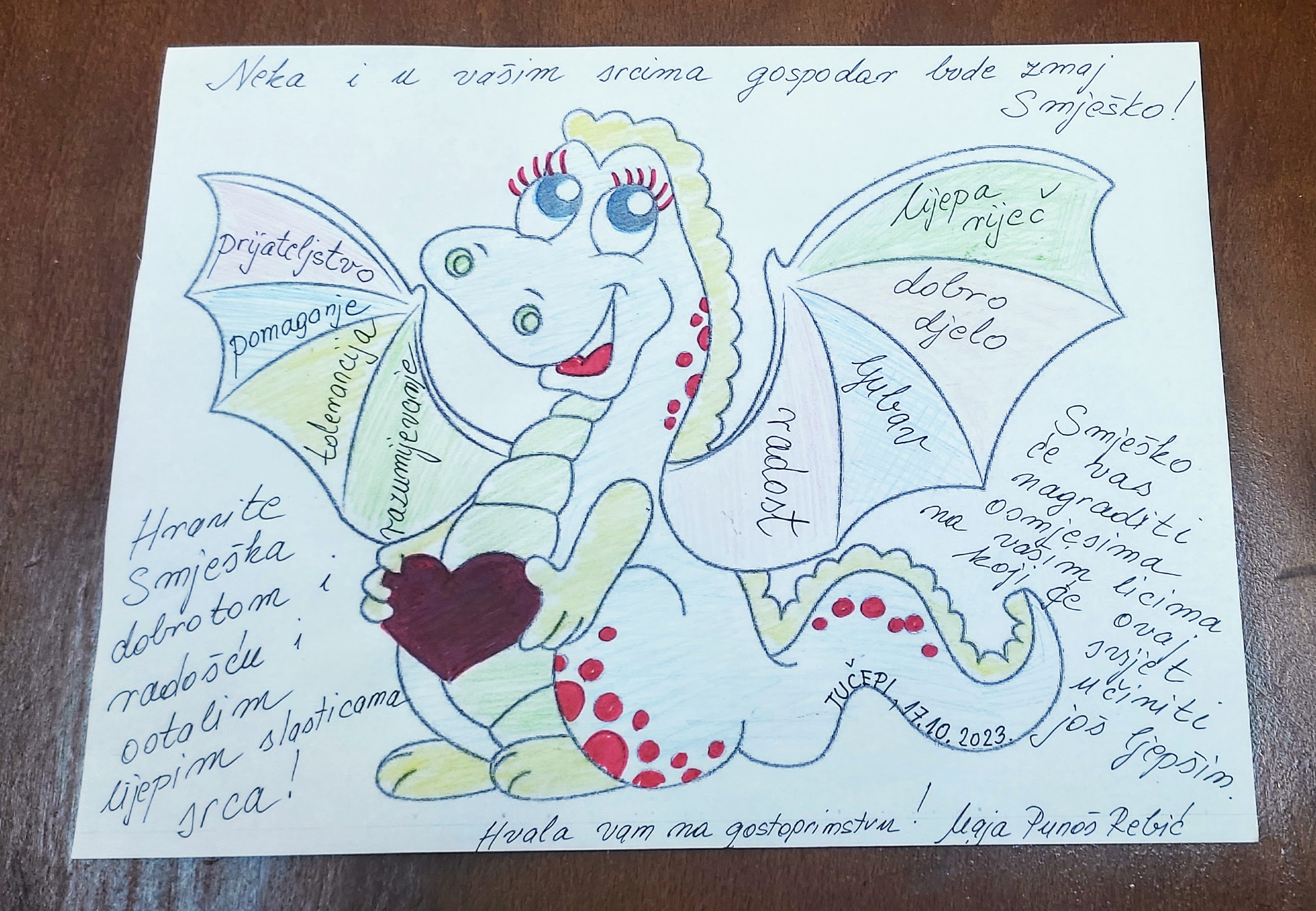 Međutim, našim učenicima je ispričala Priču o dva zmaja koja će uskoro biti tiskana. Govori o itekako aktualnoj temi – problemu današnjice, a to je vršnjačko nasilje.