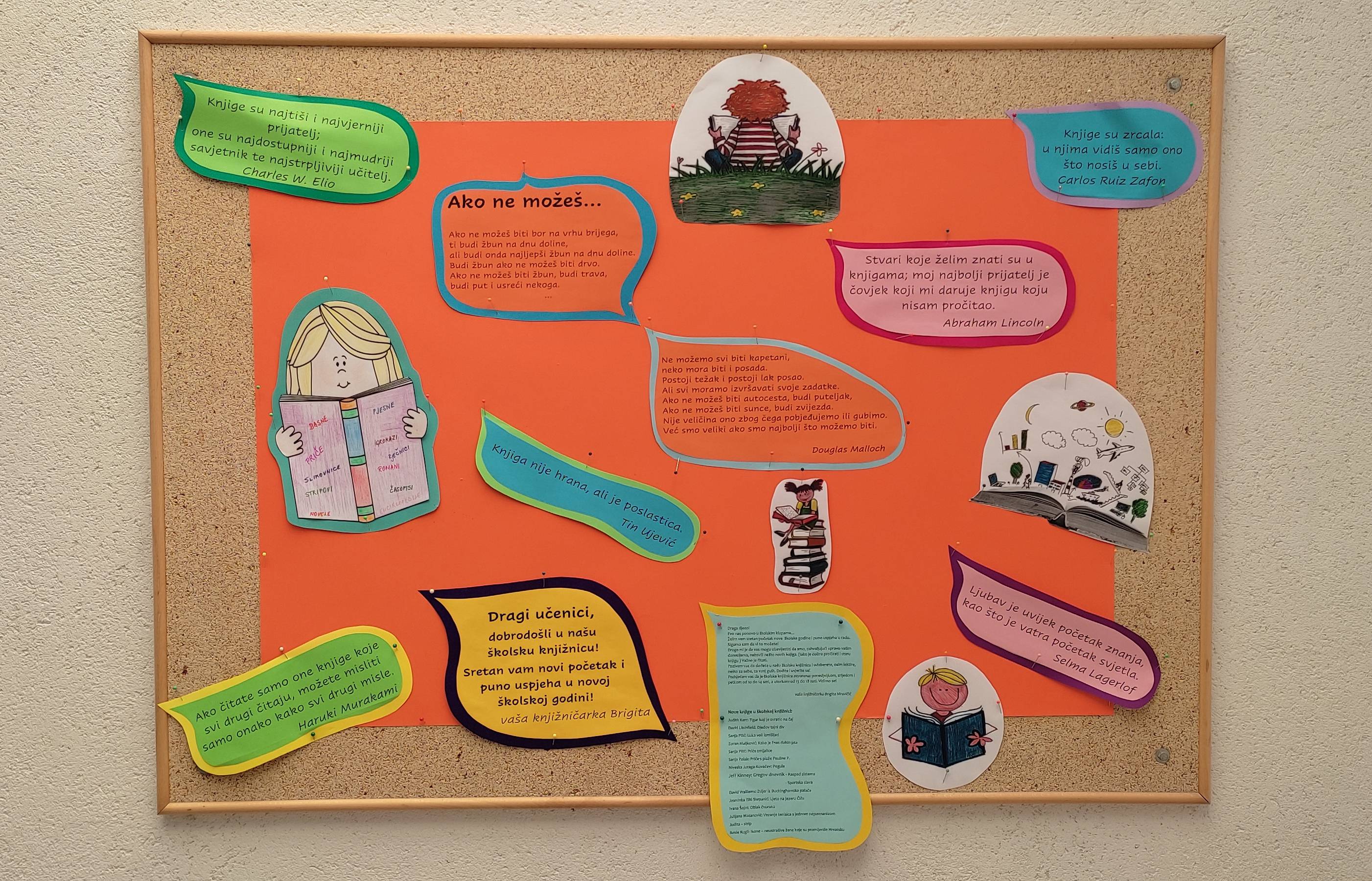 Pozivam vas da dođete u našu školsku knjižnicu i odaberete, osim lektire, nešto za sebe, za svoj gušt. Dođite i uvjerite se! Podsjećam vas da je školska knjižnica otvorena: ponedjeljkom, srijedom i petkom od 10 do 14 sati, a utorkom od 15 do 18 sati. Vidimo se!