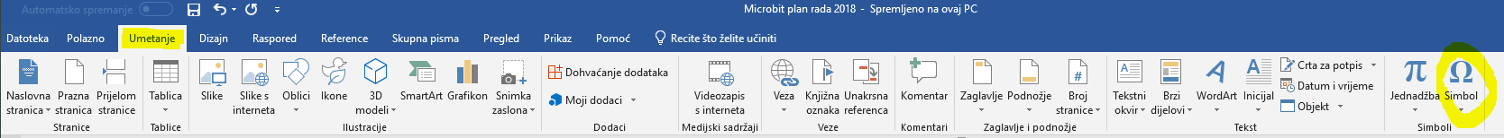 (U alatnoj traci klikni na karticu Umetni, a zatim klikni na alat Simbol pa odaberi odgovarajući simbol i klikni na gumb Spremi.)