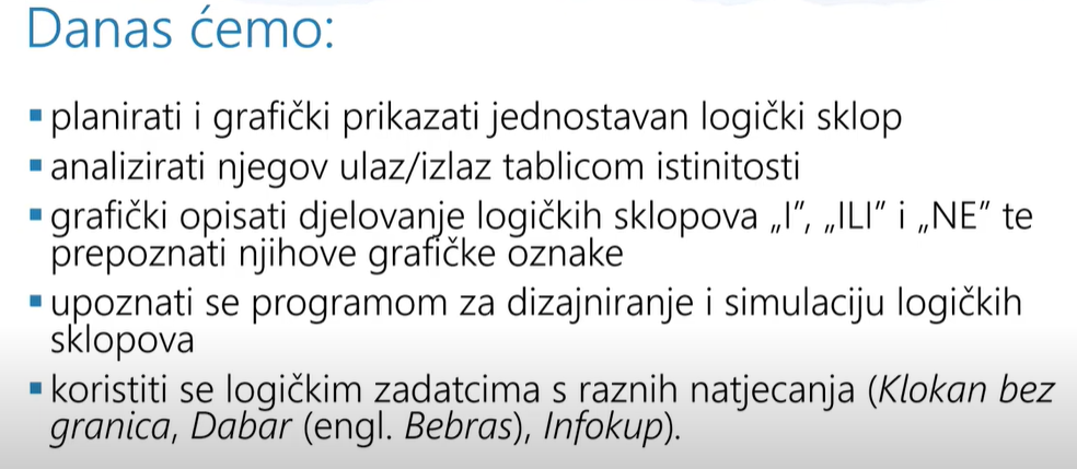 Nadam se da nakon prethodne lekcije znate prepoznati izjave koje su logičke te razlikovati istinitu tvrdnju od neistinite te opisati djelovanje jednostavnoga logičkog sklopa koji prikazuje neku logičku izjavu.