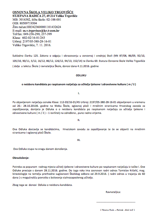 ODLUKU o neizboru kandidata po raspisanom natječaju za učitelja tjelesne i zdravstvene kulture