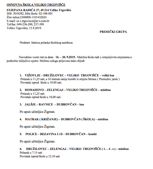 Vozni red za dane 16. – 20. 9.2019.