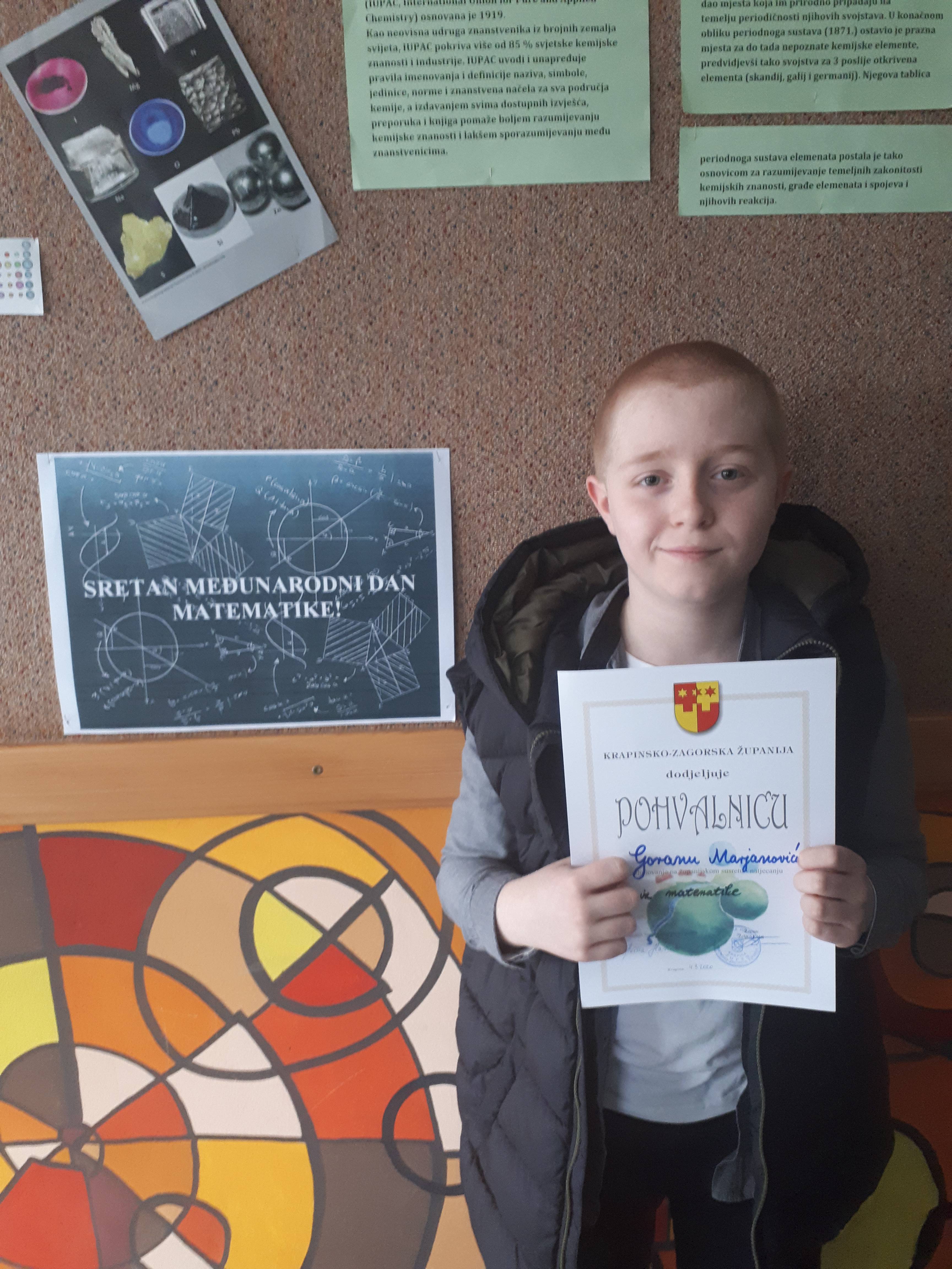 Goran Marjanović je u kategoriji najboljih matematičara iz Krapinsko – zagorske županije koji pohađaju 5. razred osvojio odlično 3. mjesto!