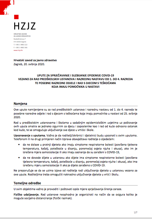 Izrađene su nove Upute HZJZ-a, a na temelju toga i Preporuke MZO-a za organizaciju rada u razrednoj nastavi i upute za vrednovanje i ocjenjivanje koje će se primjenjivati od 25. svibnja. (u prilogu)