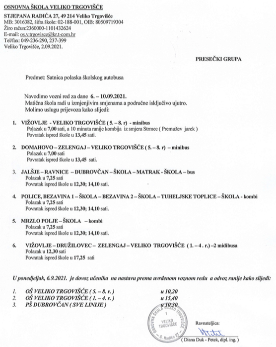Satnica polaska školskog autobusa, za prvi tjedan nastave