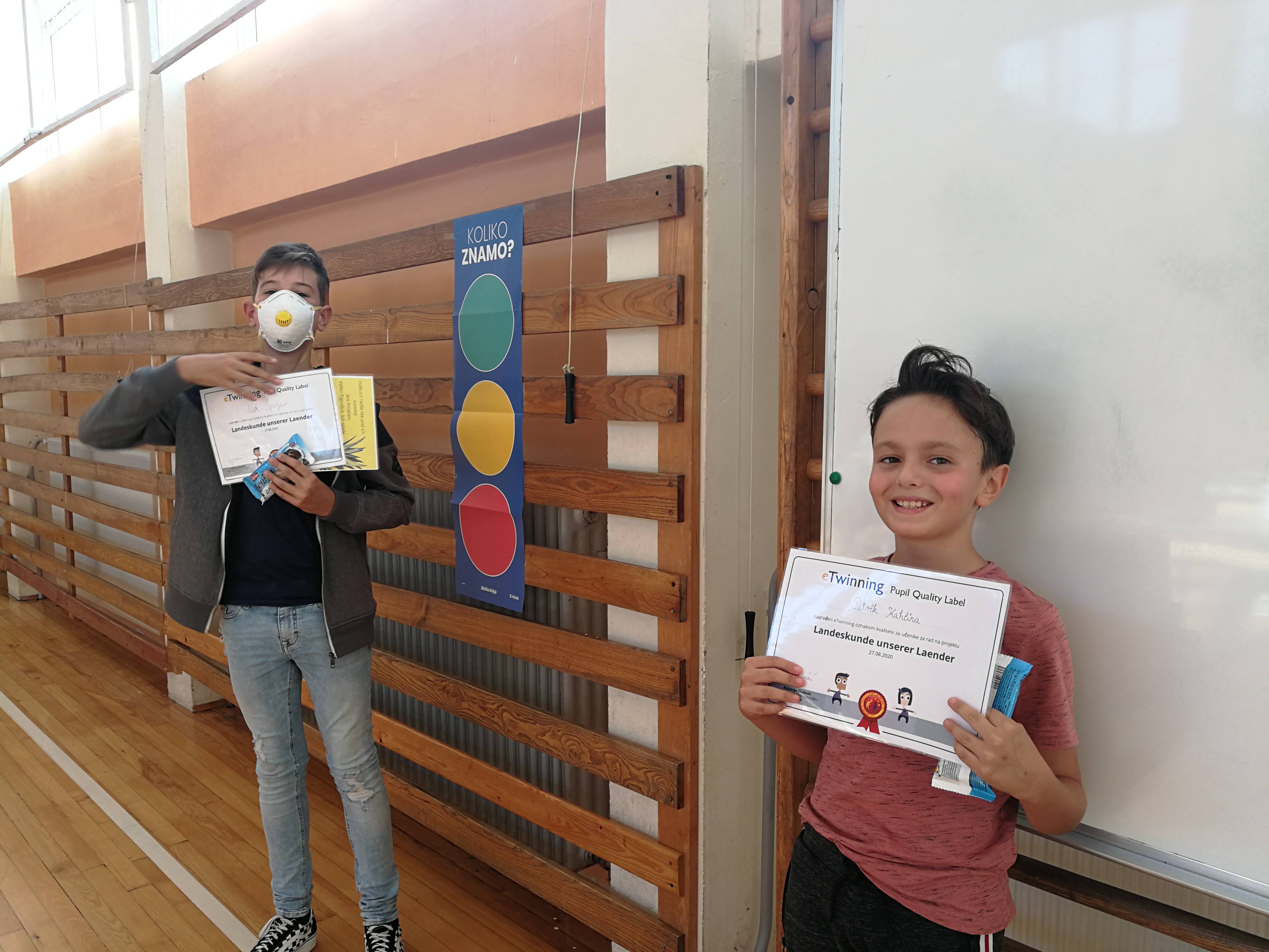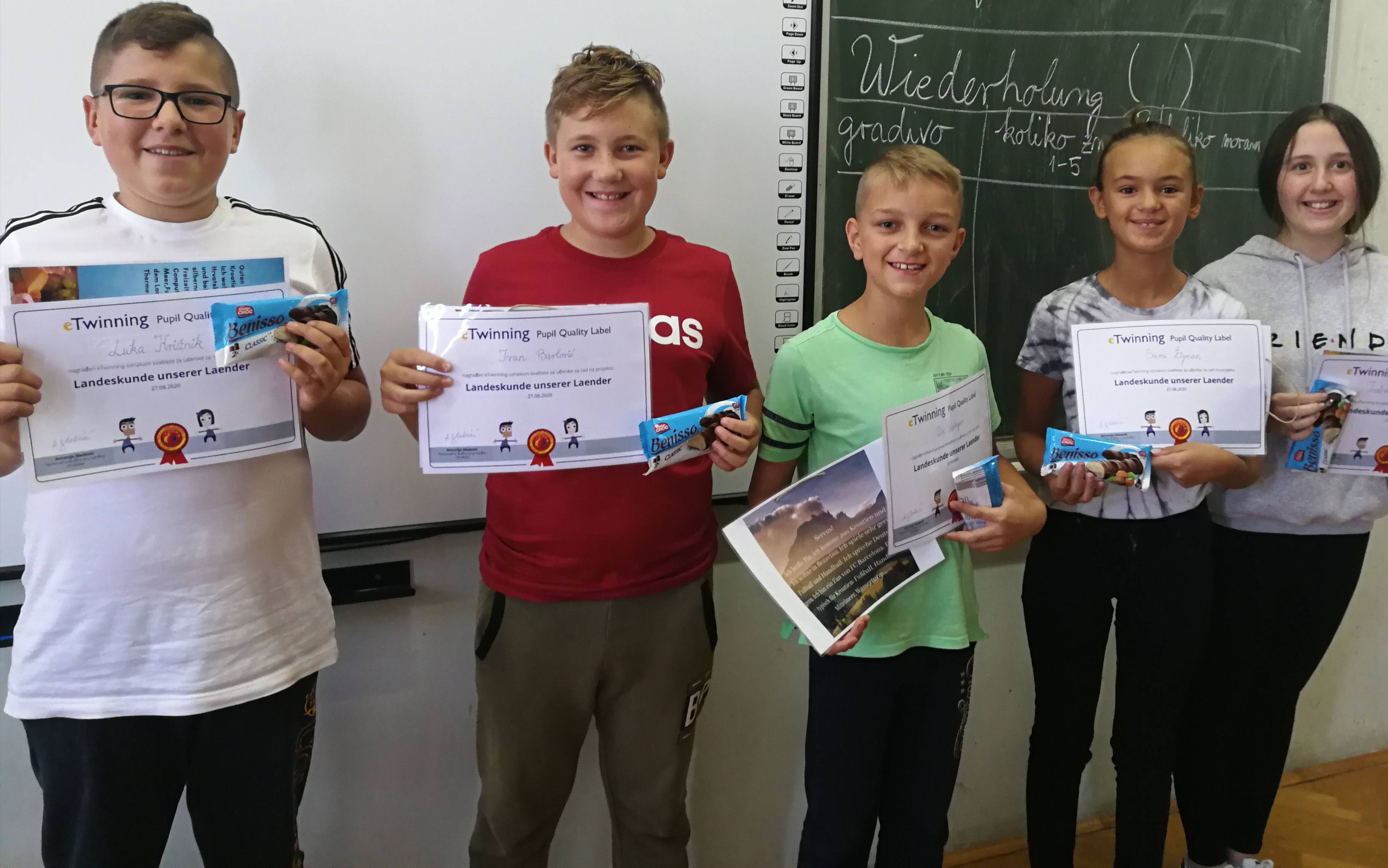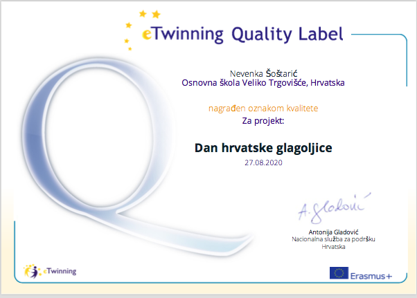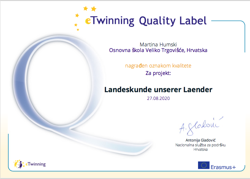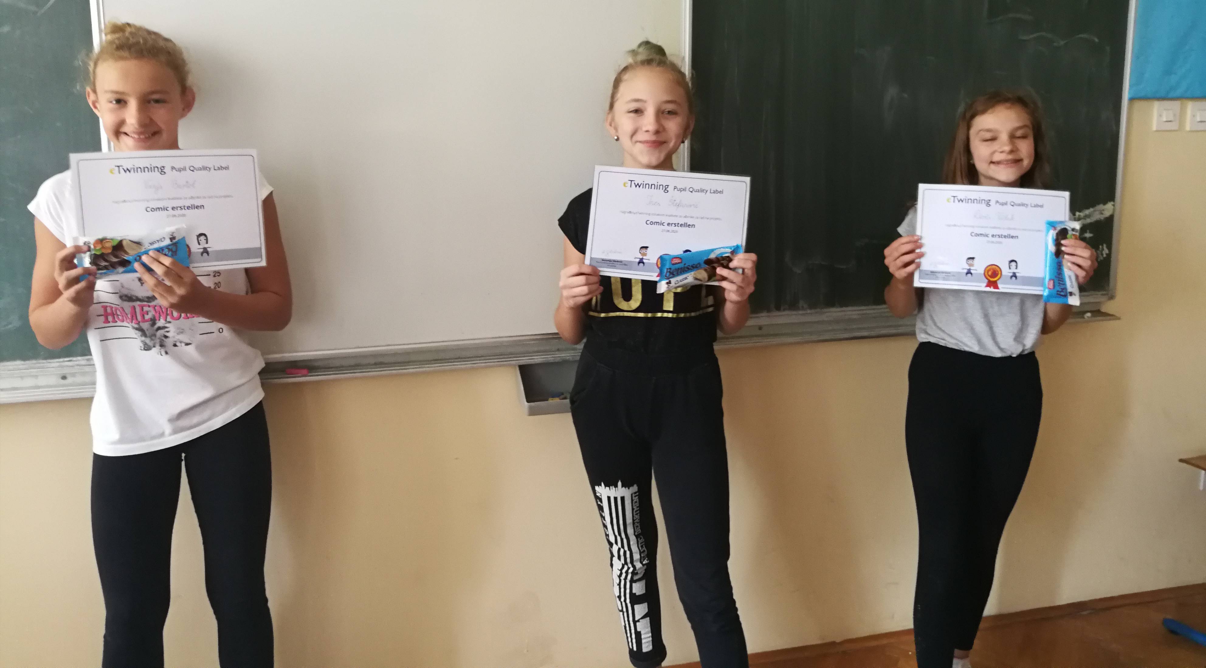 Osim što su nam pohvaljeni projekti, pohvaljeni su i učenici polaznici izborne nastave iz Njemačkog jezika koji su sudjelovali u njima (eTwinning Pupil Quality Label),te su im u tu svrhu podijeljene pohvalnice koje je izdala eTwinning Nacionalna služba za podršku u Hrvatskojna čelu s gospođom Antonijom Gladović, a pohvalnice su zasladili i poklonima svoje učiteljice (Patrik Kahlina, Goran Marjanović, Nik Špoljar, Jan Gvozdanović, Jakov Korade, Ivan Barlović, Luka Križnik, Isabella Moguljak, Tin Slakoper, Sara Žigman, Vanja Bartol, Ines Štefanović, Doris Vidak).