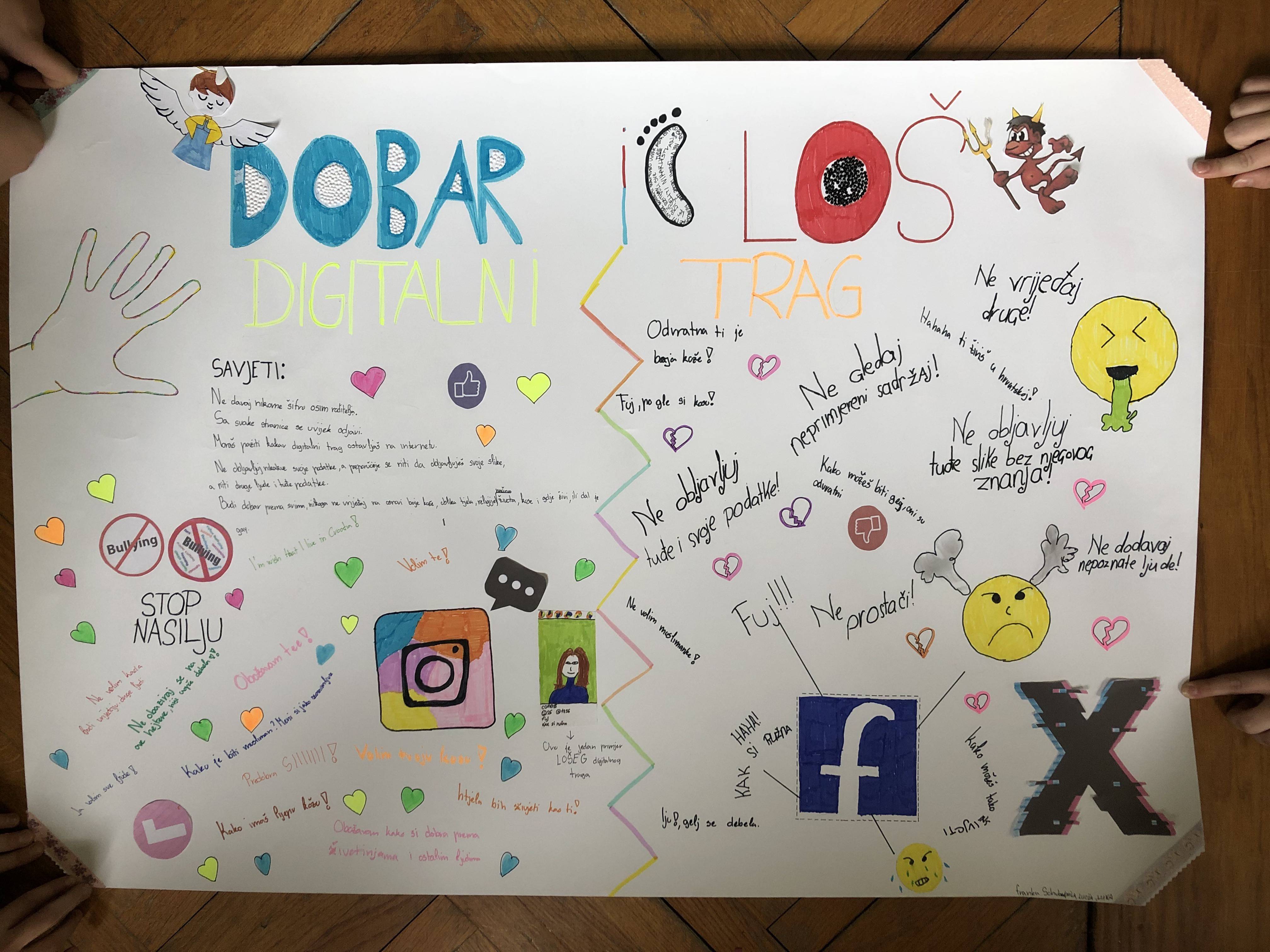 Rješavali smo kviz i Potragu za blagom, na sam dan DSI, a ostale dane smo izrađivali, u skupinama, plakate u papirnatom obliku o digitalnim tragovima, digitalne plakate s našom osmišljenom maskotom PETko-m i rime u pisanom i audio obliku o sigurnosti na mreži.