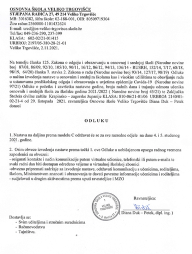 Nastava na daljinu prema modelu C održavat će se za sve razredne odjele na dane 4. i 5. studenog 2021. godine.