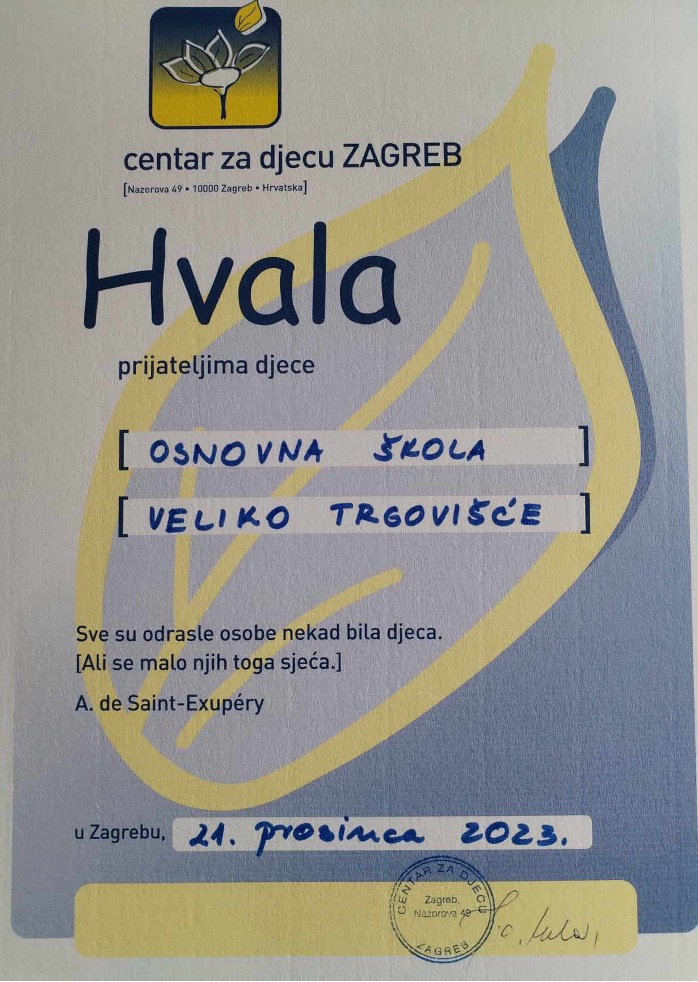 Kutije dobrote, odnosno zapakirane pakete za djecu iz Nazorove odaslali smo 21. prosinca 2023. godine u čemu nam je rado pomoglo naše DVD Veliko Trgovišće omogućivši kombi i vozača. Ovim putem zahvaljujemo DVD-u Veliko Trgovišće na pomoći.
