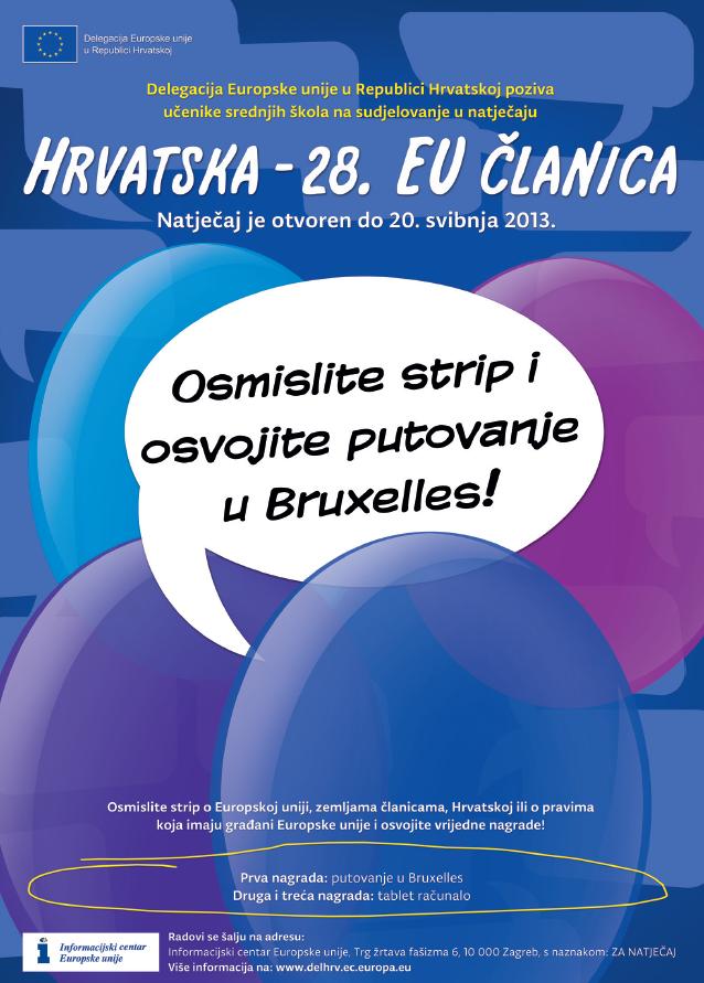 Povodom skorog pristupanja Hrvatske Europskoj uniji, Delegacija EU-a u RH raspisuje natječaj pod nazivom “Hrvatska – 28. članica EU-a”. Cilj natječaja je podizanje svijesti o pitanjima koja se tiču EU-a te obilježavanje pristupanja Hrvatske Europskoj uniji, planiranom za 1. srpnja 2013. Natječaj je otvoren do 20. svibnja 2013. godine.