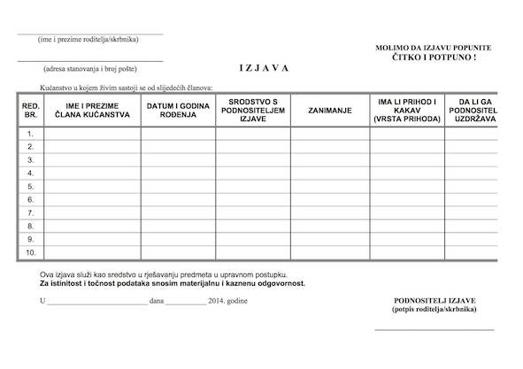 Uz zahtjev se predaje Izjava o zajedničkom kućanstvu (također obrazac) i ostala potrebna dokumentacija kojom se dokazuju činjenice bitne za ostvarivanje prava (potvrde o prihodima, potvrde o redovitom školovanju, dokaze da je obitelj jednoroditeljska i dr.).